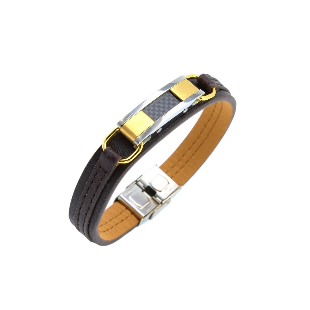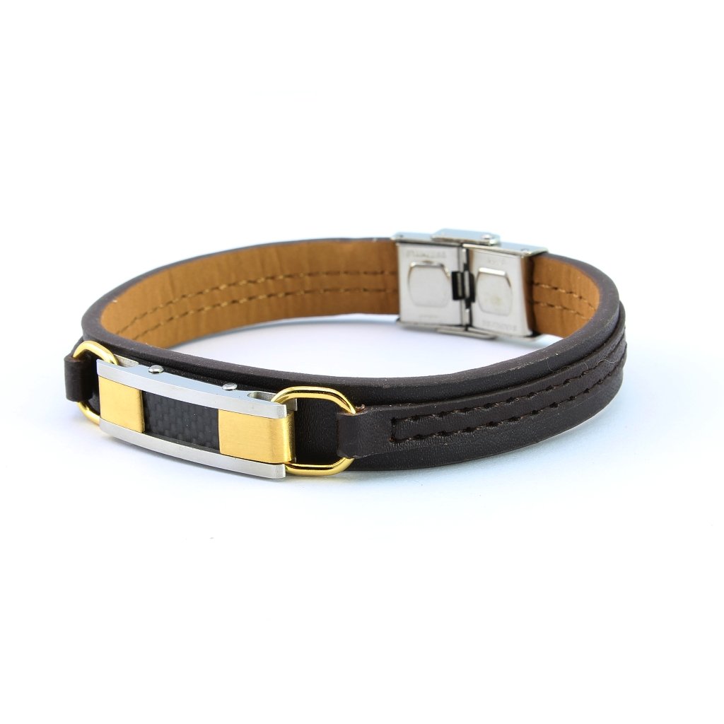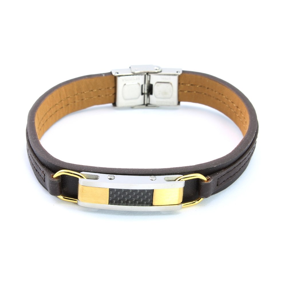 Náramok je vyrobený z tmavohnedej eko kože a je v kombinácii s chirurgickou oceľou. Všetky kovové časti na tomto náramku či už je to platnička n vrchu náramku alebo zapínanie náramku sú z kvalitnej chirurgickej ocele 316L. Platnička je na náramku uchytená dvomi očkami. Materiál chirurgická oceľ nekoroduje a nemení farbu a je hypoalergénna.