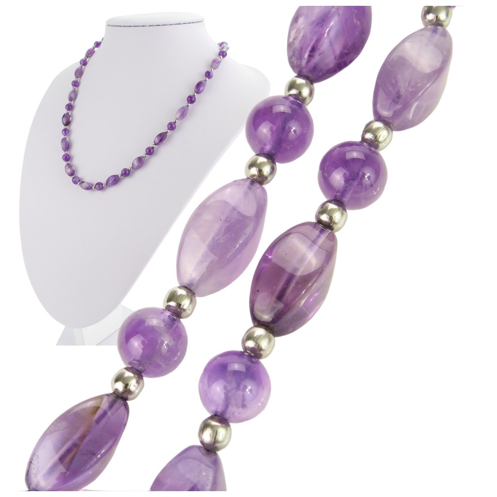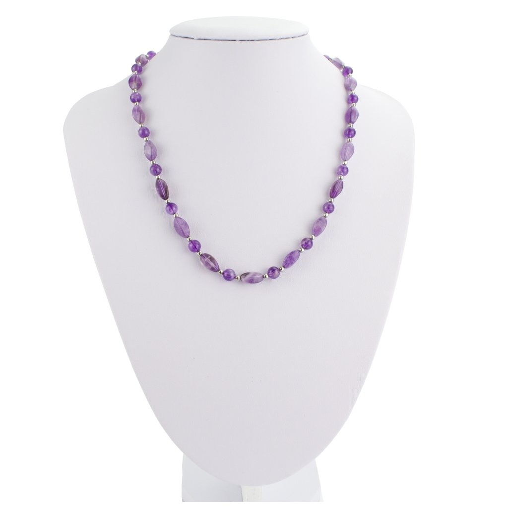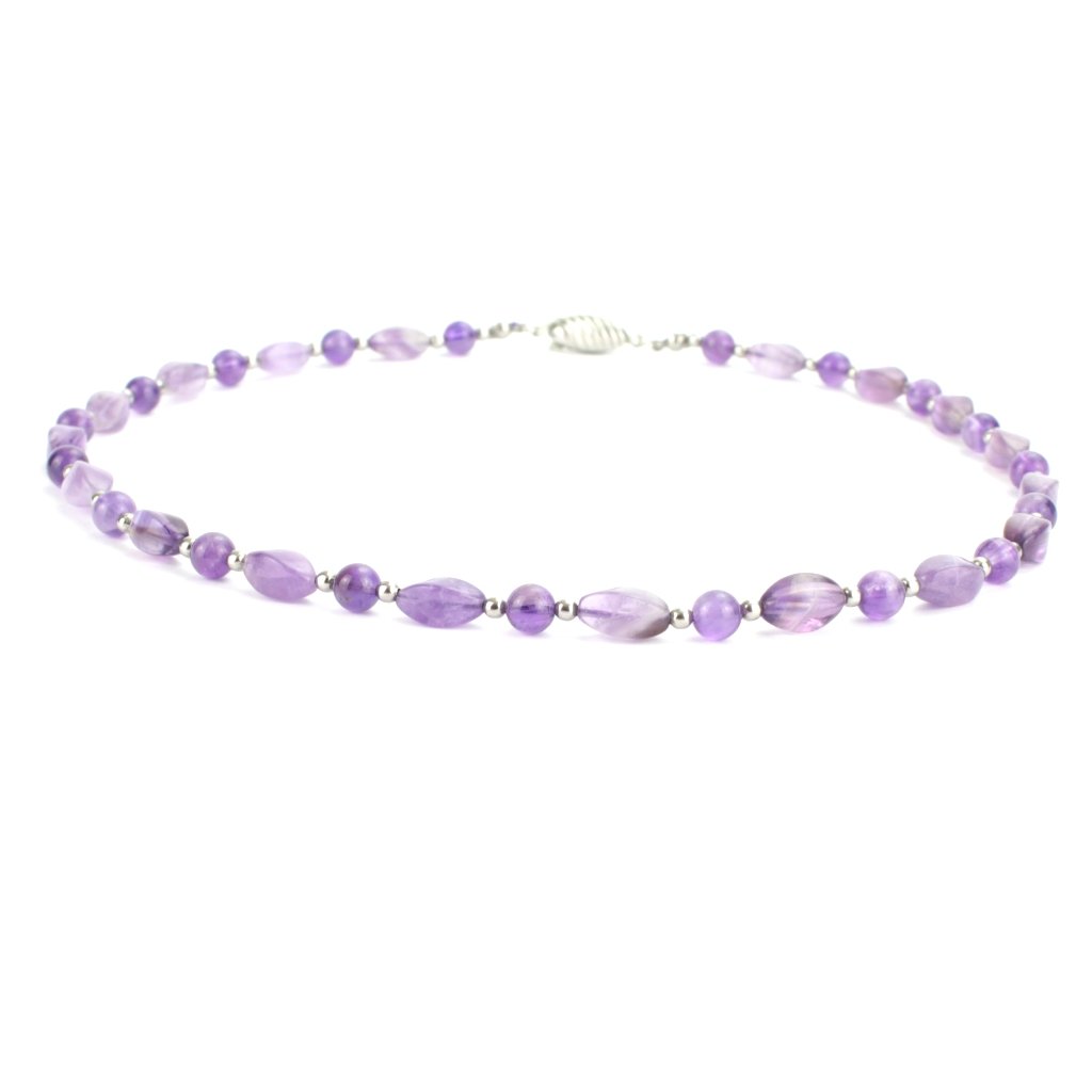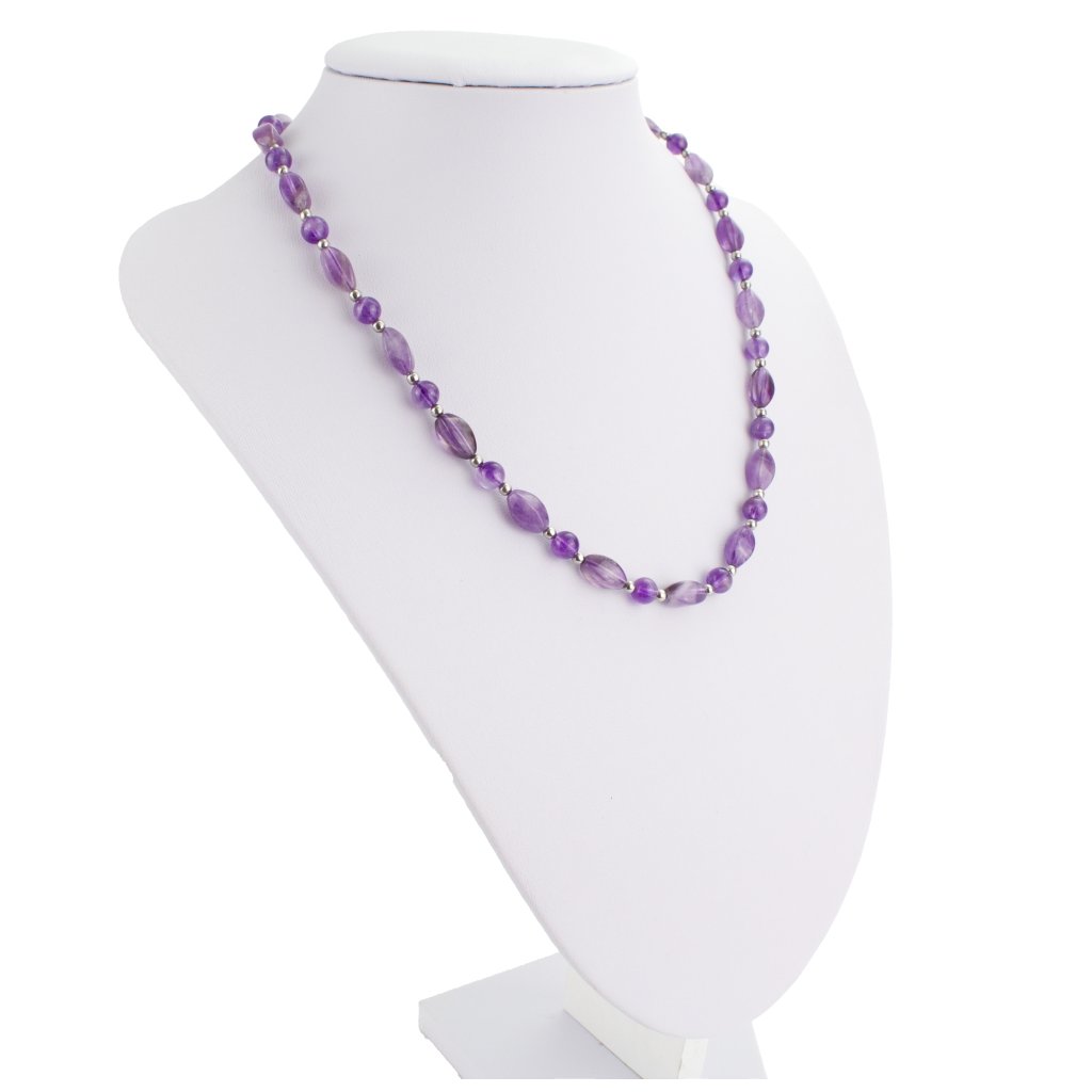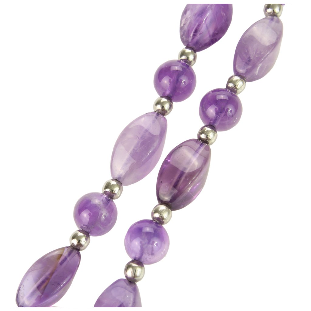 Jedinečný luxusný náhrdelník z prírodného nefarbeného polodrahokamu ametyst. Korálky v tvare točených oválikov sa striedajú s guľatými korálkami. Jednotlivé korálky ametystu sú od seba oddelené korálkami z chirurgickej ocele. V meditatívnej a liečiteľskej praxi je ametyst veľmi silný a žiadaný kameň. Tento náhrdelník je vhodný na meditatívne a liečebné účinky, nakoľko je z pravého prírodného ametystu a nie je dofarbovaný. Luxusný náhrdelník značky ALEXIS MARTEN z kombinácie korálkov oválneho a guľatého tvaru, kombinovaných s korálkami z chirurgickej ocele. Bezpečnostné zapínanie z chirurgickej ocele chráni náhrdelník pred stratou. Návlek na špeciálnej niti zo 100% prírodného hodvábu. Náhrdelník je vhodný na každodenné nosenie do práce, ale nádherne doplní aj spoločenské oblečenie. Takýto náhrdelník je skvelý darček a každé ženské srdce zažiari. A nakoľko všetky kovové časti sú z kvalitnej chirurgickej ocele (žiadna lacná bižutéria)tak šperk Vám vydrží veľmi dlho.