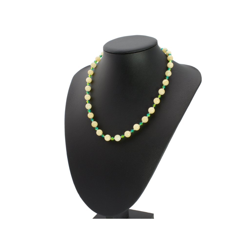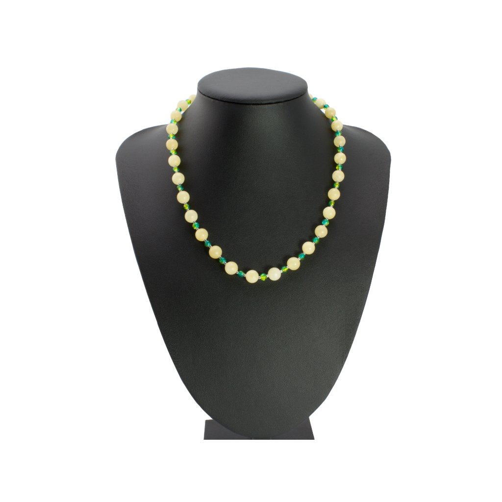 Dámsky náhrdelník z polodrahokamu Jadeit v kombinácii so zelenými sklenenými korálkami /práskačky / a s chirurgickou oceľou. Polodrahokam Jadeit sa považuje sa za polodrahokam vyrovnanosti čistoty a prináša svojmu majiteľovi šťastie, priateľstvo, sebestačnosť a nezávislosť. Taktiež je jadeit veľmi vhodný k zvýšeniu plodnosti.Jedinečný dámsky náhrdelník vhodný na bežné nosenie avšak sa dá taktiež dobre prispôsobiť aj k slávnostnejšiemu outfitu