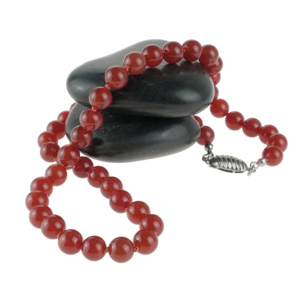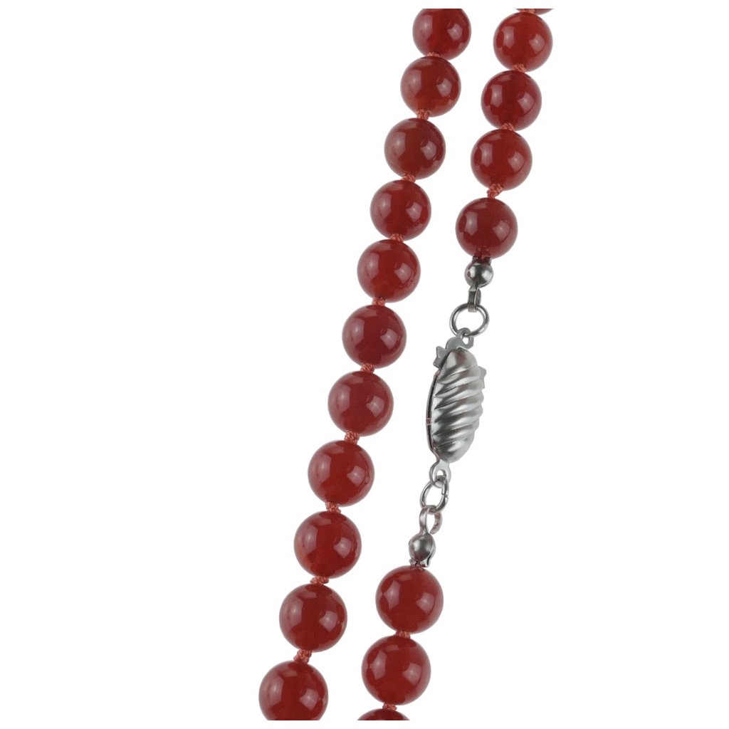 Krásny dámsky náhrdelník z prírodného polodrahokamu Karneol v ohnivo červenej farbe s oranžovým podtónom. Tento náhrdelník zvýrazní nie len vašu osobnosť, ale vás aj nabije energiou a ochráni proti urieknutiu. Tento náhrdelník je ručne robený metódou uzlíkovania slovenskej značky ALEXIS MARTEN Bezpečnostné zapínanie z chirurgickej ocele chráni náhrdelník pred stratou. Návlek na špeciálnej niti zo 100% prírodného hodvábu. Náhrdelník je vhodný na každodenné nosenie do práce, kde pozdvihne vaše sebavedomnie a ochráni vás pred intrigami a neprajníkmi. Ak si ho vezmete do spoločnosti, vyzdvihne vašu vášnivú stránku.