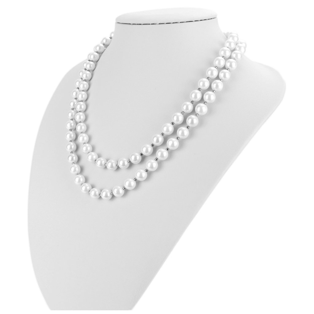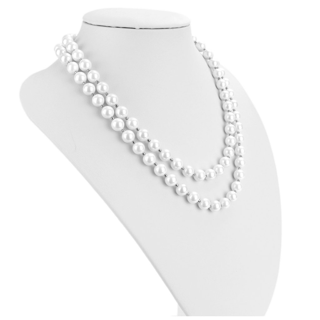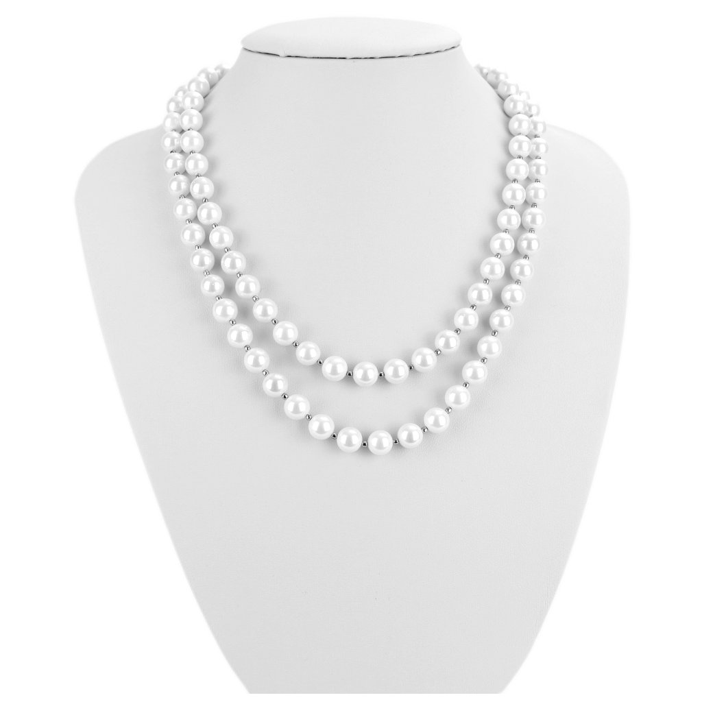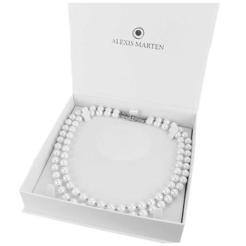 Krásny a elegantný náhrdelník značky ALEXIS MARTEN z perál bielej farby dvojradový. Je to klasický dvojradový perlový náhrdelník vyrobený so shell perál. Medzi perlami su guličky z striebornej farbe z vyskokvalitnej chirugickej ocele. Tieto guličky z chirurgickej ocele dodajú šperku krásny strieborný efetk a zároveň zabranujú prelám, aby sa o seba dotíkali . Perly sú navlečené na špeciálnej niti zo 100% prírodného hodvábu, odolnej voči pretrhnutiu. Priemer perál je 8 mm.Ozdobné bezpečnostně zapínanie z chirurgickej ocele. Dlžka vnútorneho radu je 44 cm a dlžka vonajšieho radu je 48 cm. Tento krasný nahrdelník sa svojou dlžkou hodí ku všetkym tipom výstrihov a je určený pre všetky vekové skupiny.