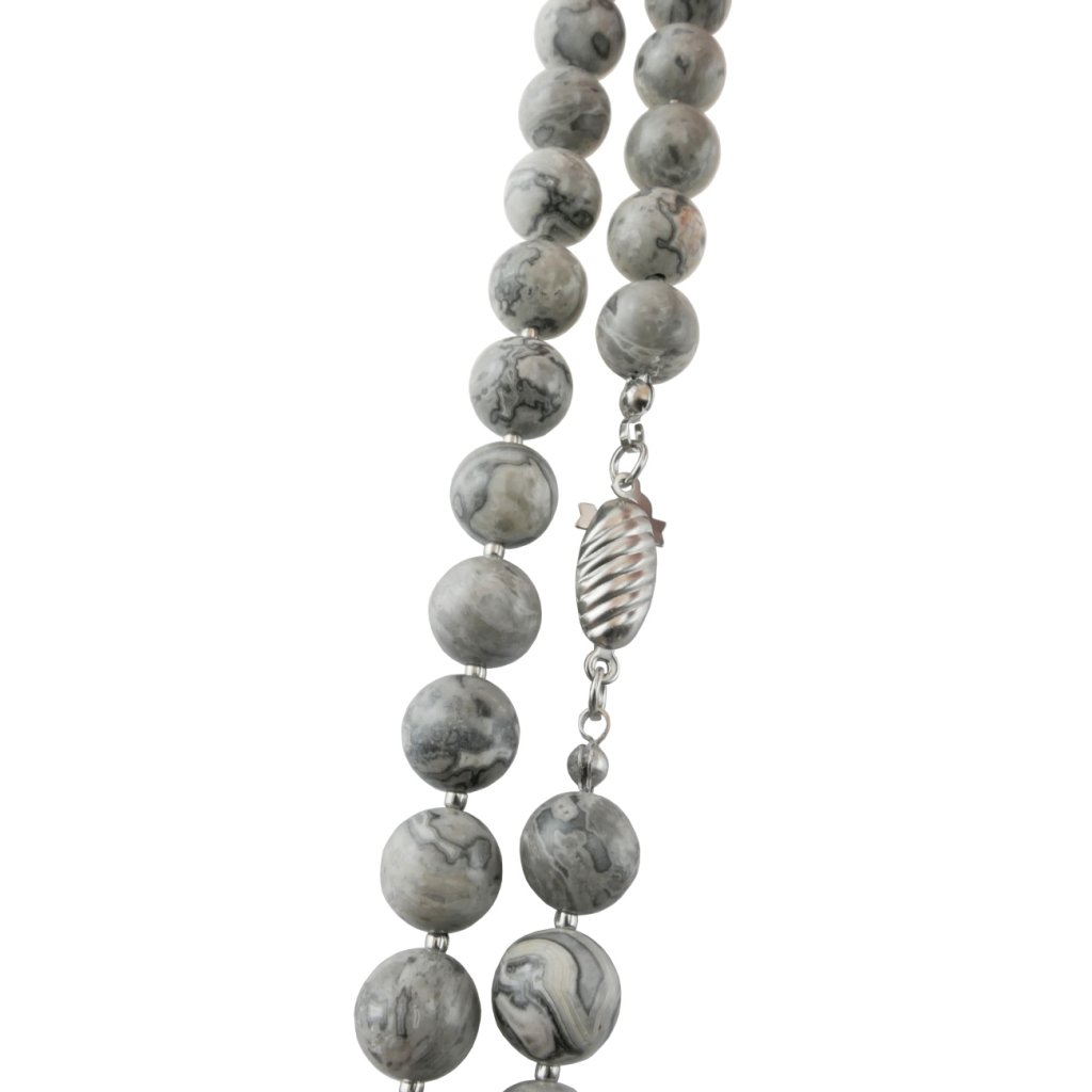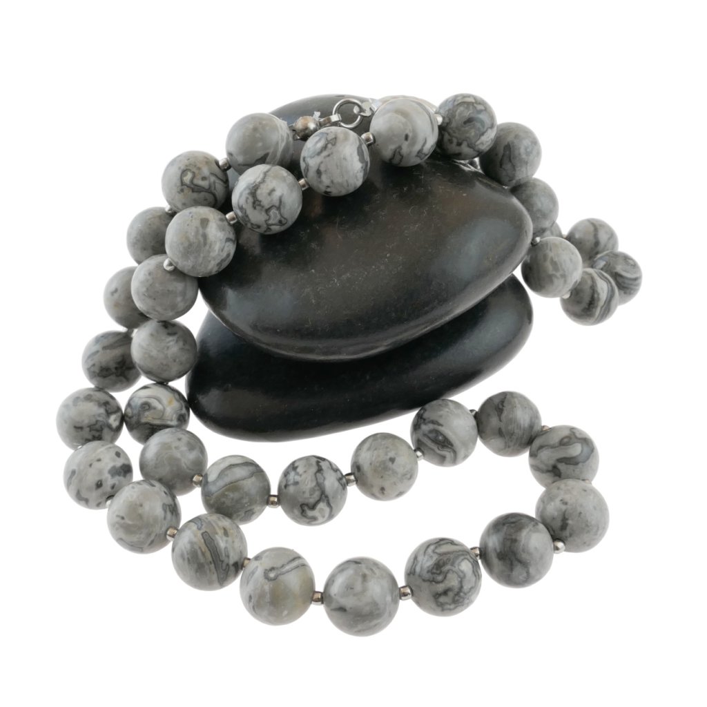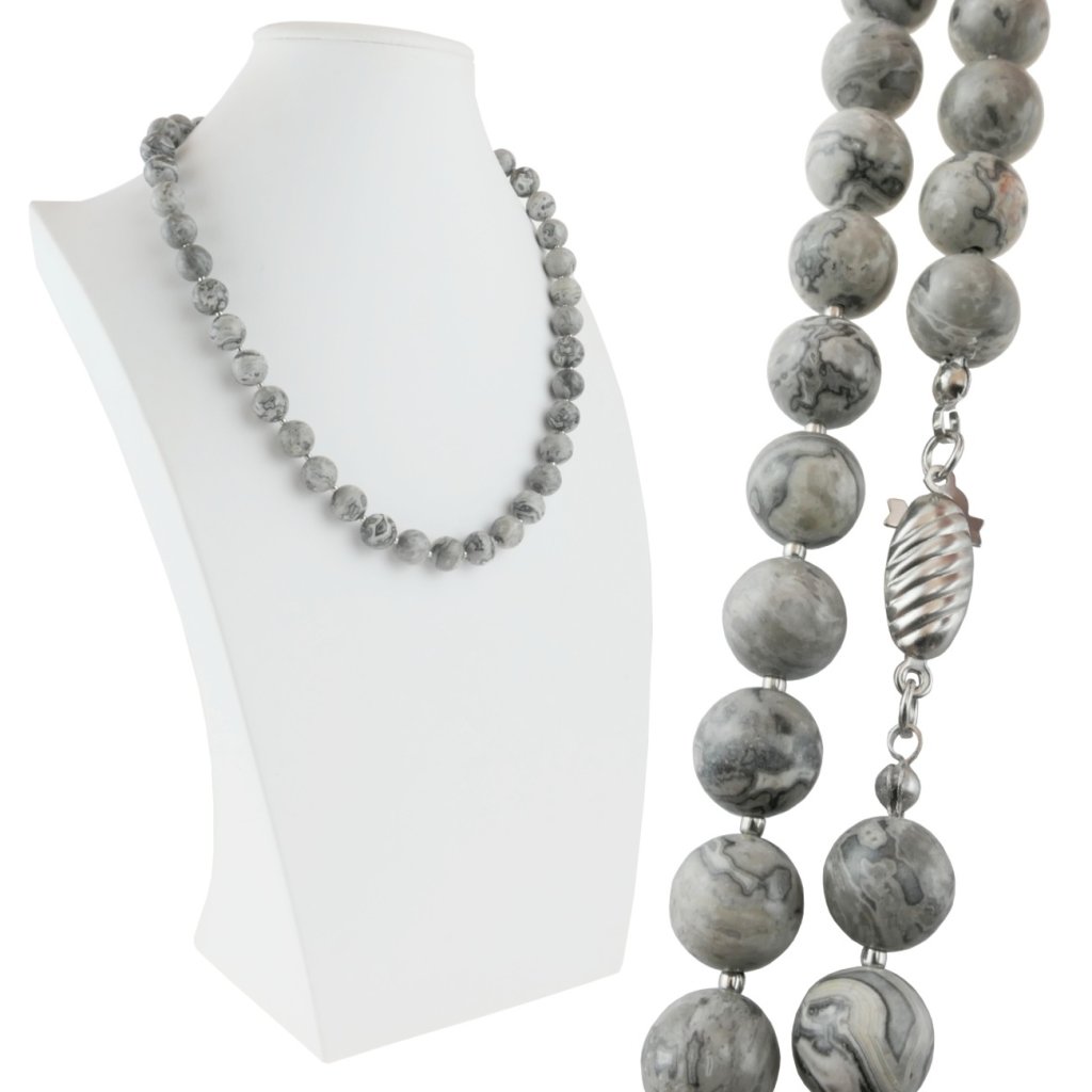 Krásny dámsky náhrdelník z polodrahokamu Jaspis Fancy v kombinácii s korálkami z chirurgickej ocele. O polodrahokame Jaspis sa vraví, že je to matka všetkých polodrahokamov. Z mystických vlastnosti jaspisu spomenieme len pár, ako napríklad ochrana pred duchovnými nástrahami, alebo tíšenie bolesti spôsobenej láskou. Vzbudzuje túžbu robiť dobro a byť lepším človekom. Tento krásny šperk s krásnou kresbou sa mimoriadne hodí k elegantnému outfitu. Luxusný šperk pre elegantné dámy.