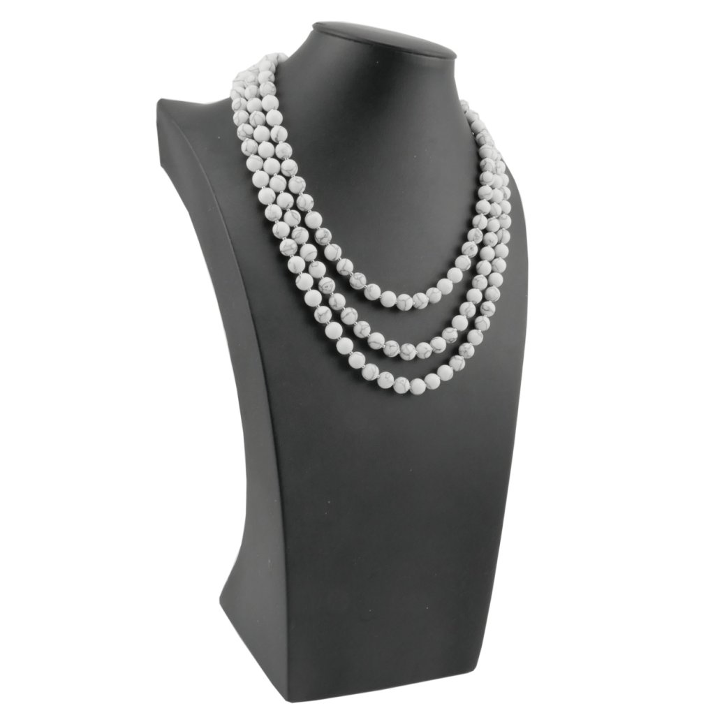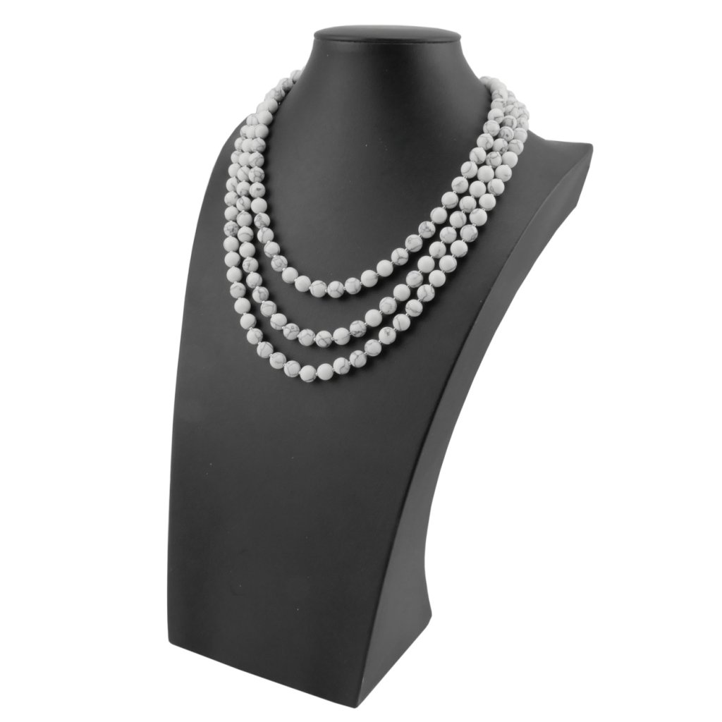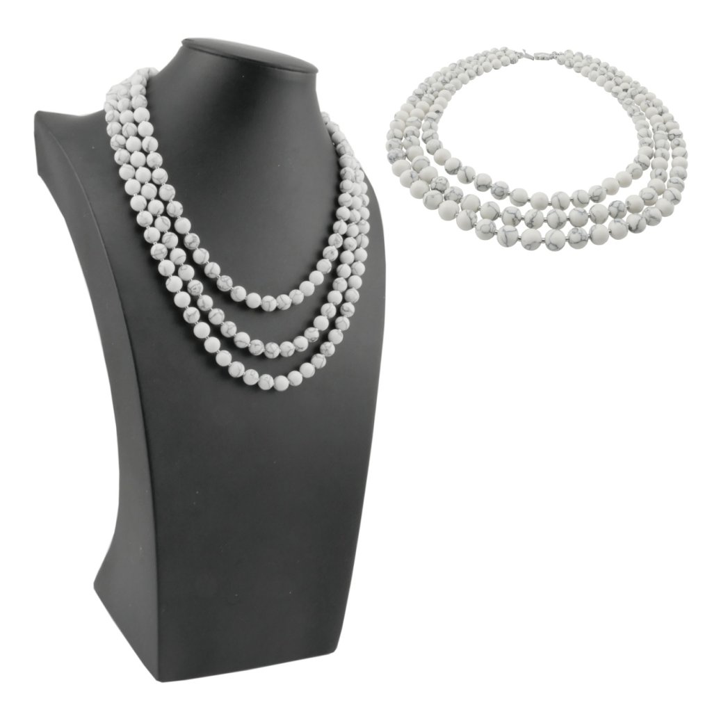 Krásny trojradový dámsky náhrdelník z polodrahokamu Howlit v jeho typickej bielej farby s čiernymi žilkami. Polodrahokam Howlit patrí k mimoriadnym upokojujúcim kameňom. Náhrdelník je navlečený na niti a je kombinovaný s malými korálkami z kvalitnej chirurgickej ocele. Zapínanie náhrdelníku je ozdobné a je taktiež z kvalitnej chirurgickej ocele.