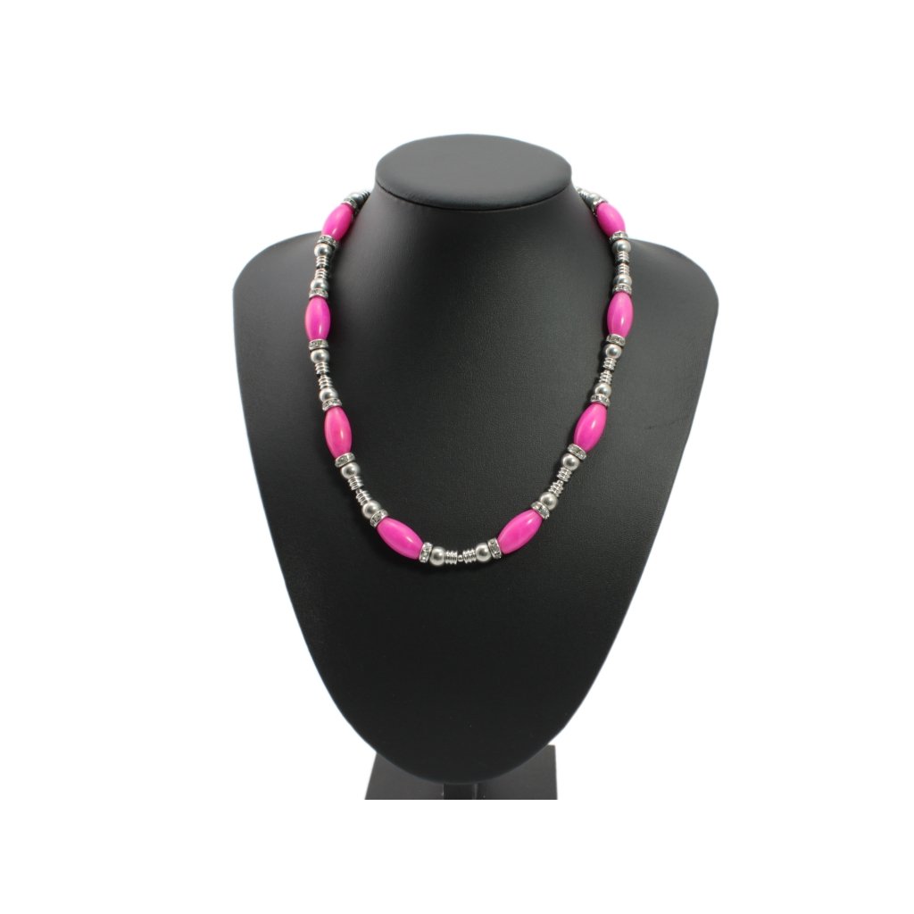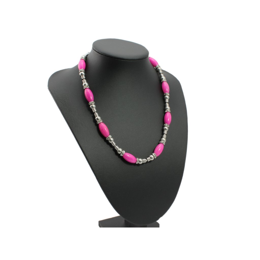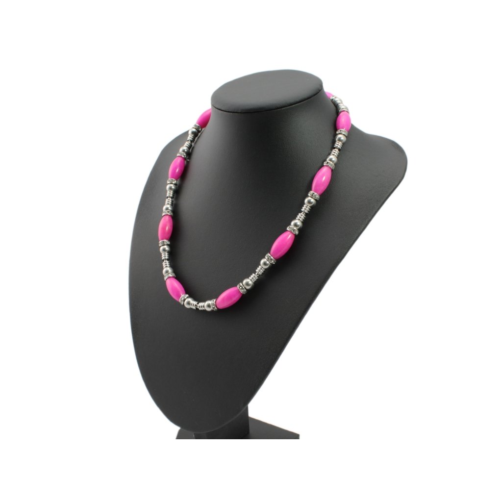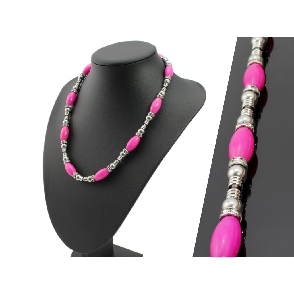 Náhrdelník je vyrobený z ružových ovalných koráliek z polodrahokamu Achát v kombinácii koráliek z chirurgickej ocele a rodeliek v ktorých sú vsadené očká z kubického zirkónu čírej farby. Veľkosť ružových koráliek polodrahokamu Achátu je 20 mm a veľkosť koráliek z chirurgickej ocele je 6 mm. Zapínanie náramku je na karabínu s predlžovaciu retiazkou. Náramok je navlečený na špeciálnej niti zo 100 % prírodného hodvábu odolnej voči pretrhnutiu. Nakoľko všetky kovové časti náramku sú z chirurgickej ocele, ktorá nehrdzavie a nemení farbu tak ako to býva pri bižutérii tak Vám šperk vydrží veľmi dlho.