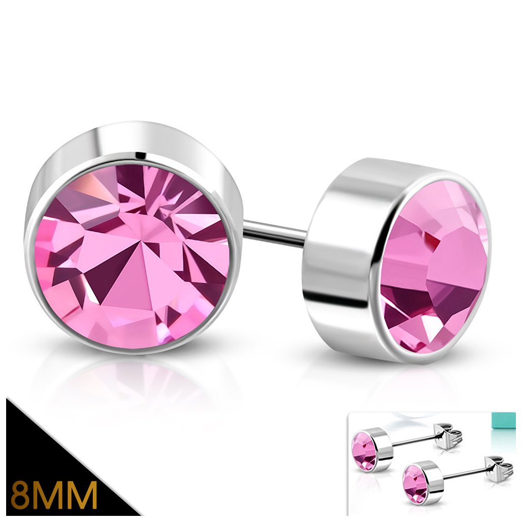 Napichovacie náušnice z chirurgickej ocele s brúseným očkom ružovej farby. Očko je vsadené do kruhového lôžka, vďaka čomu pôsobí náušnica kompaktne. Priemer lôžka je 8 mm. Pôvabné, dobre kombinovateľné náušnice z chirurgickej ocele bez alergických reakcií.