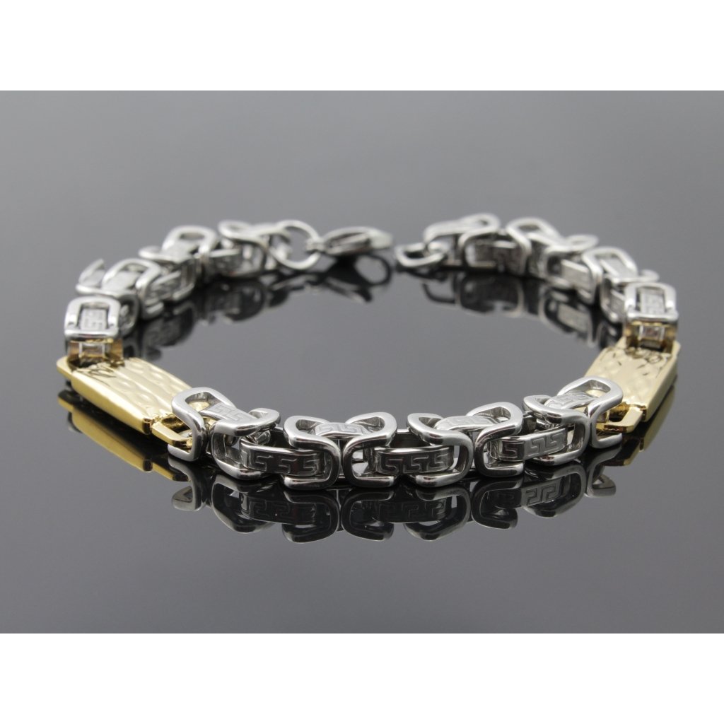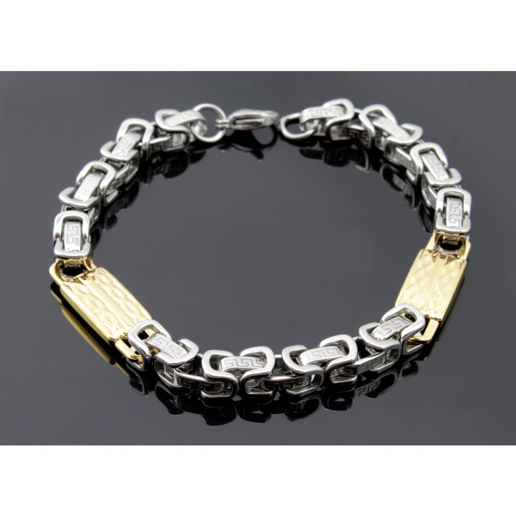 Pánsky hrubý náramok v kombinácii zlatej a striebornej farby z chirurgickej ocele. Náramok je zložený z retiazky kráľovský vzor v kombinácii dvoch gravírovaných platničiek v zlatej farbe . Kráľovsky vzor je veľmi populárny a moderný. Tento náramok z chirurgickej ocele je vhodný na bežné každodenné nosenie a pre všetky vekové kategórie.