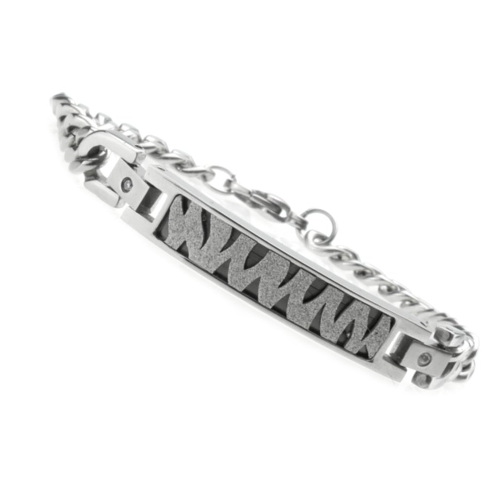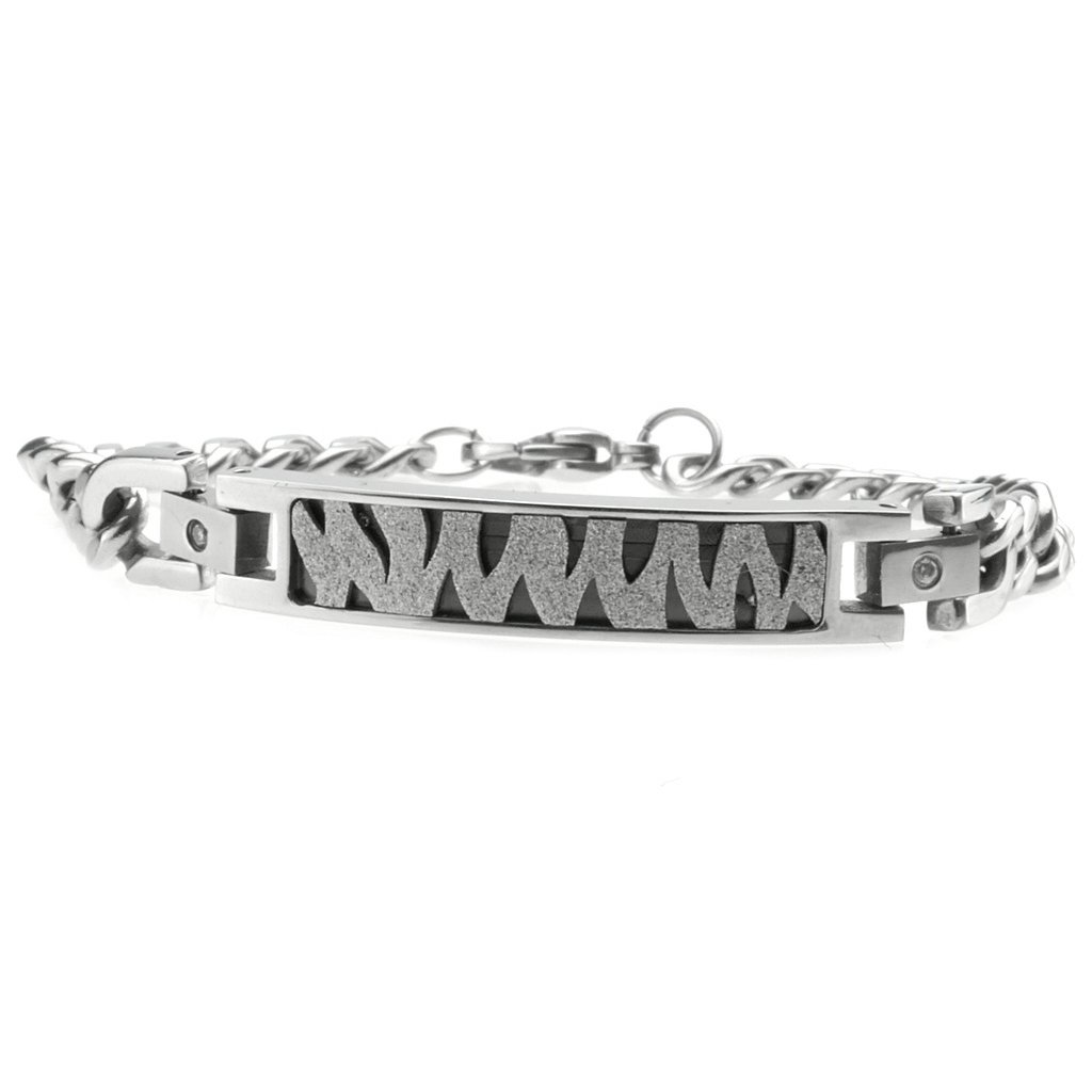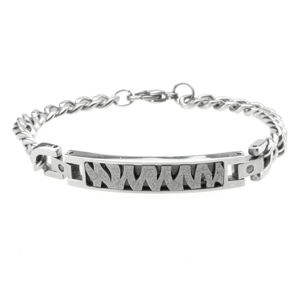 Štýlový retiazkový náramok z chirurgickej ocele s ozdobnou platničkou. Platnička je ozdobená zebrovým pieskovaným vzorom, ktorý sa pri lome svetla trbliece. Platnička je napojená článkom, ktorý je zdobený jedným očkom z kubického zirkónu. Veľmi krásny, elegantný a moderný náramok vhodný pre pánov ale aj dámy v každom veku.Celý náramok aj so zapínaním je vyrobený z veľmi kvalitnej chirurgickej ocele. Zapínanie náramku je hodinkového tipu. Tento šperk Vám vydrží dlho nakoľko chirurgická oceľ nekoroduje a nemení farbu ako je to bežné pri klasickej bižutérii a striebre.