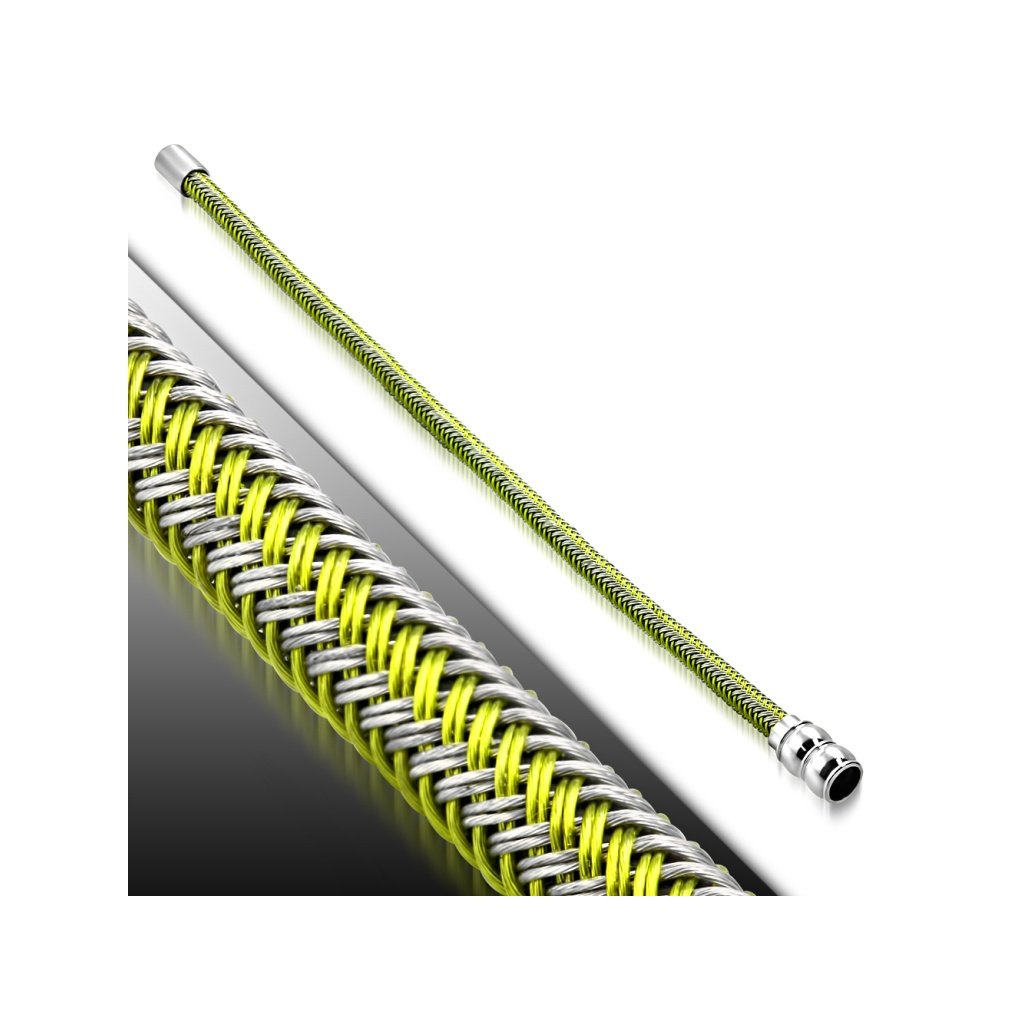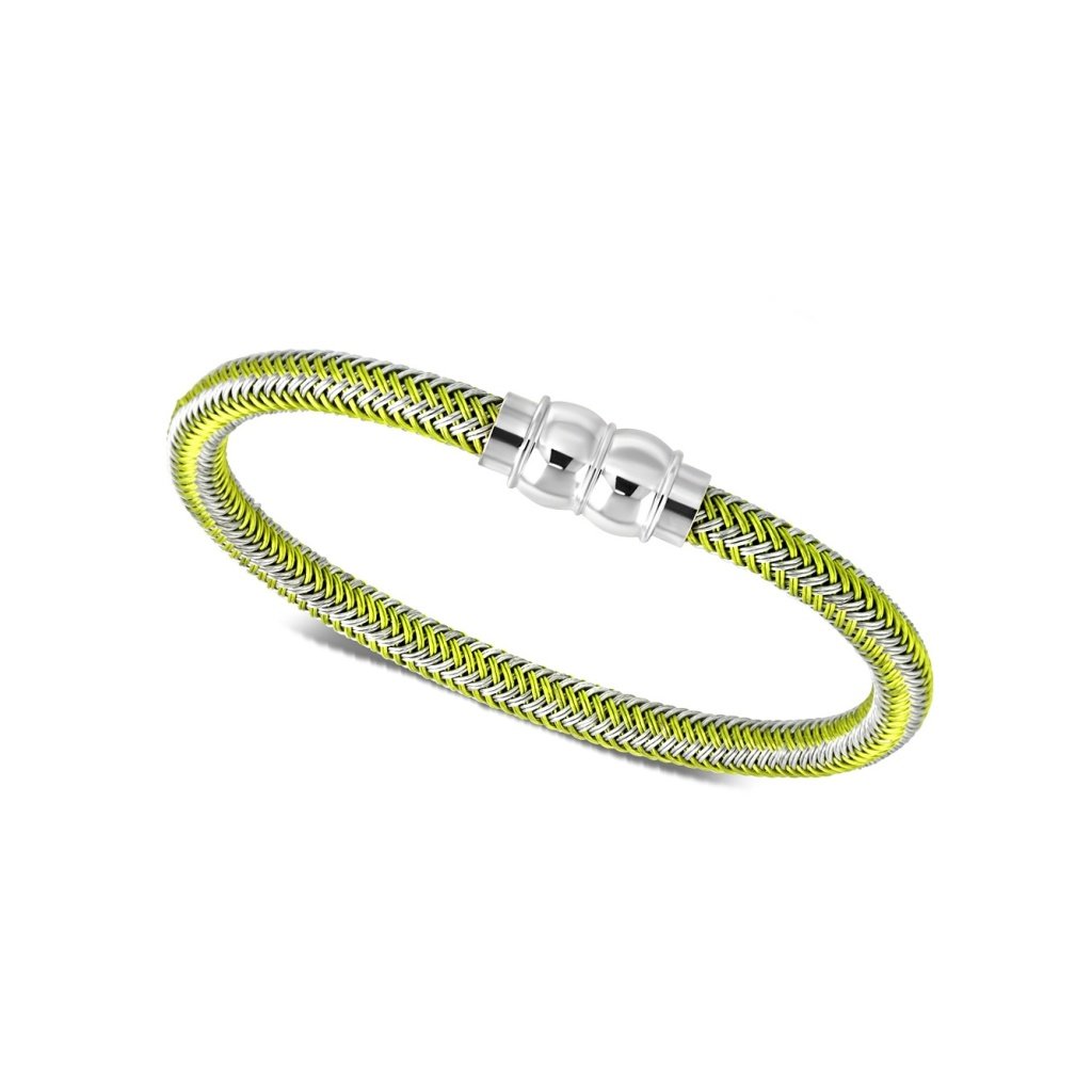 Dámsky náramok z chirurgickej ocele v striebornej a žltej farbe. Náramok je vyrobený z tenkej prepletanej ocele do okrúhleho tvaru. Na náramku sa strieda strieborná a žltá farba, čo vytvára krásnu farebnú kombináciu. Náramok je vhodný pre dámy a výborne sa dá zladiť s inými šperkami, ako napríklad s retiazkou alebo s náušnicami. Zapínanie náramku je magnetické, čo uľahčuje manipuláciu so šperkom. Chirurgická oceľ, z ktorej je vyrobený celý náramok je kvalitný materiál, ktorý neoroduje a nečerná. Nepotrebuje žiadnu špeciálnu starostlivosť a je vhodný na každodenné nosenie.