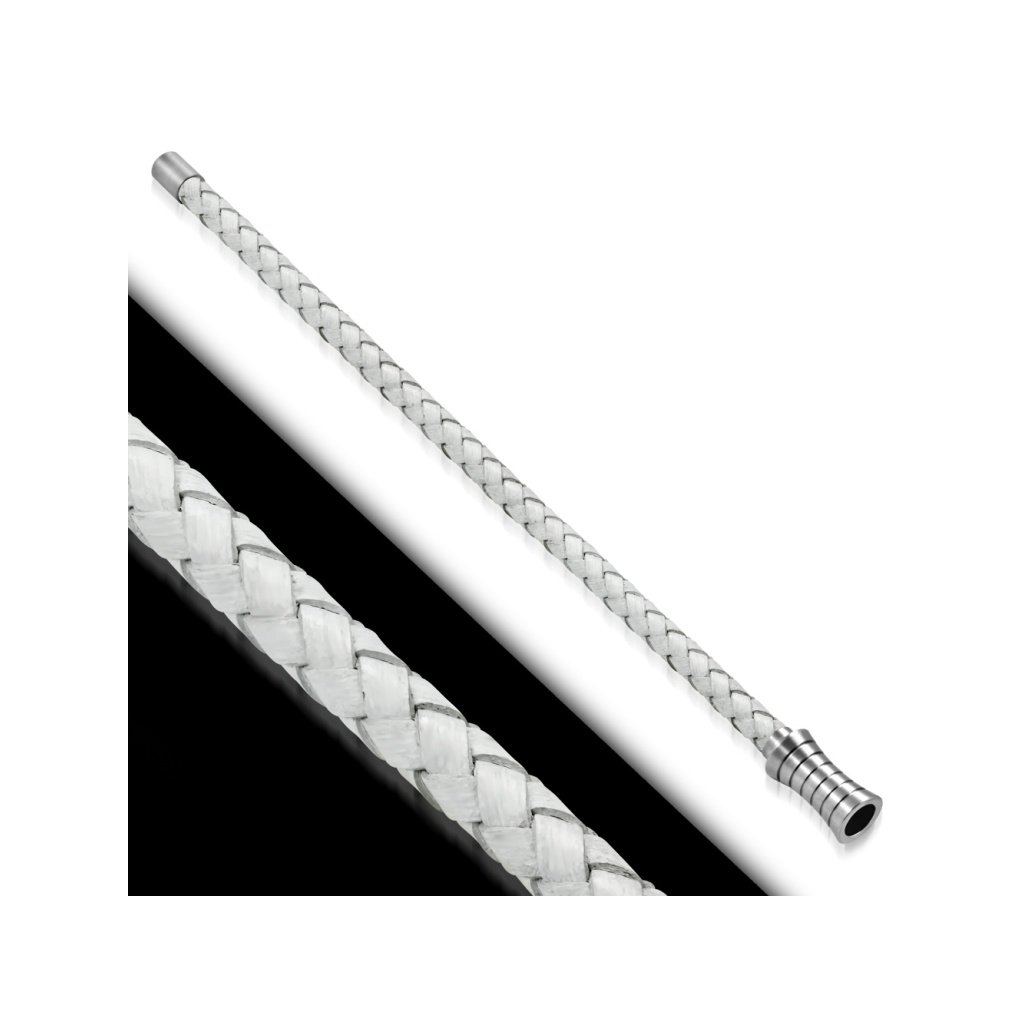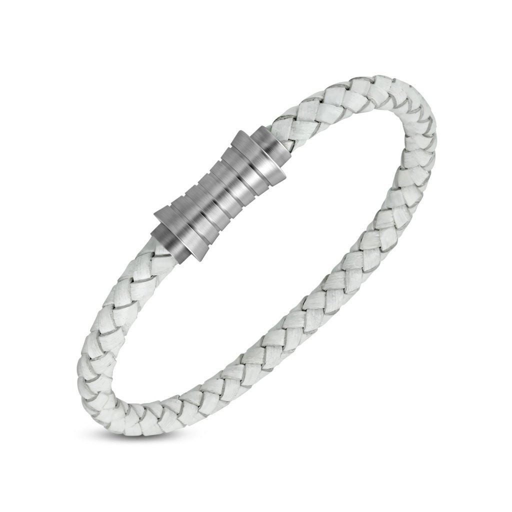 Unisex náramok vyrobený z eko kože a chirurgickej ocele. Náramok je bielej farby a má prepletaný vzor. Zapínanie je vyrobené z kvalitnej chirurgickej ocele, ktorá nekoroduje a nečerná. Magnetické zapínanie uľahčuje používanie náramku. Eko koža je príjemná na nosenie, chirurgická oceľ zas zaručí dlhú živosť náramku. Náramok sa dá ľahko doladiť náušnicami, príveskom alebo samostatnou retiazkou. Jednoduchý, no veľmi pekný náramok sa hodí pre dámy aj pre pánov.