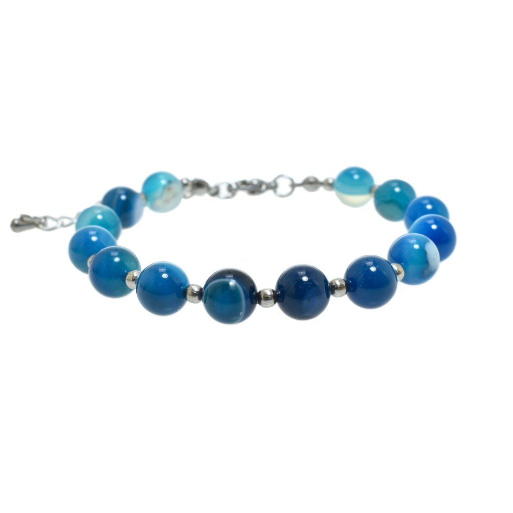 Krásny dámsky náramok vyrobený z polodrahokamu Achát v kombinácií s chirurgickou oceľou. Guličky sú vyrobené z obľúbeného Achátu pruhovaného nafarbeného v krásnej modrej farbe. Jeho výnimočnosť spočíva v tom, že každá gulička je iná, má iné modré sfarbenie a to vytvára unikátny celok. Sila polodrahokamu Achát je v jeho sile a harmónií, ktorú prináša svojmu nositeľovi. Dodáva silu a odvahu a odbúrava tak strach a stres. Zapínanie náramku je vyrobené z kvalitnej chirurgickej ocele a disponuje praktickou predĺženou retiazkou, vďaka ktorej si viete nastaviť potrebnú dĺžku náramku. Tento náramok si viete doplniť aj náhrdelníkom z polodrahokamu Achát.