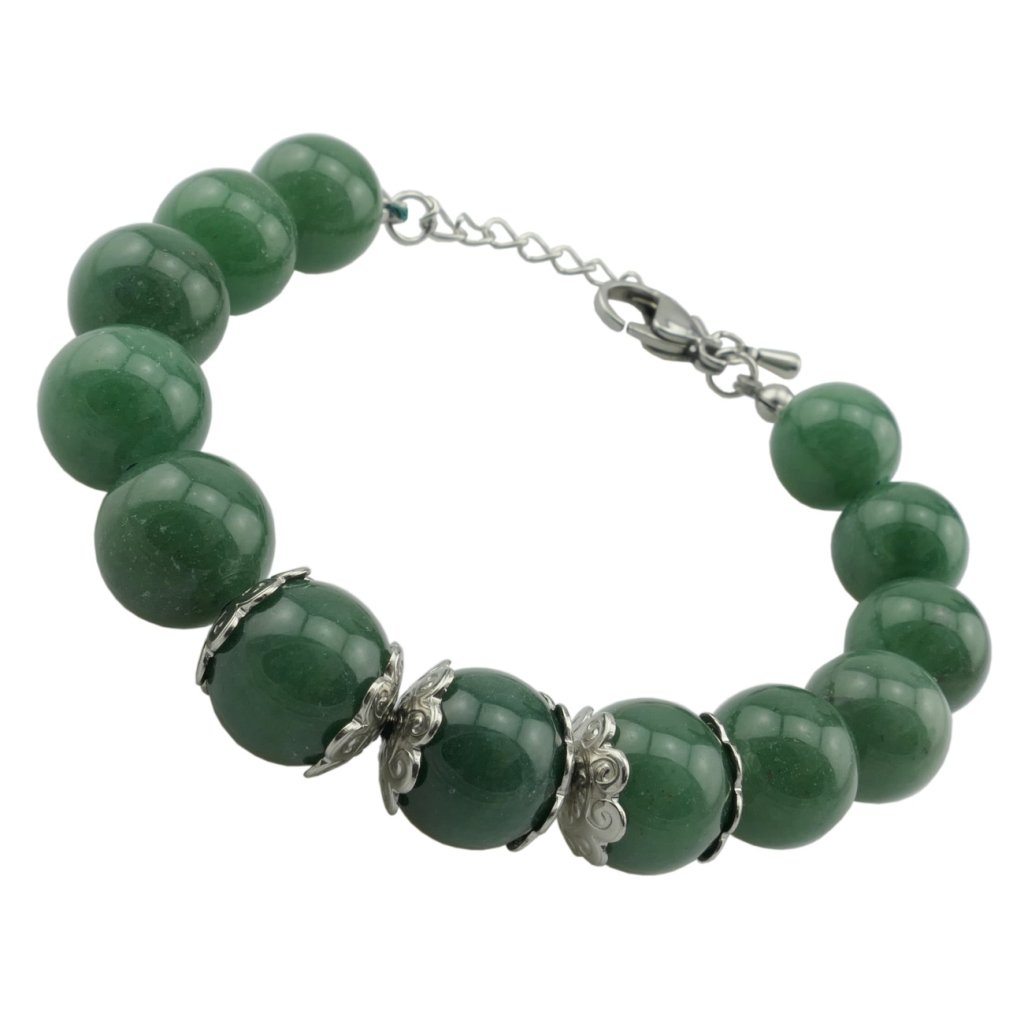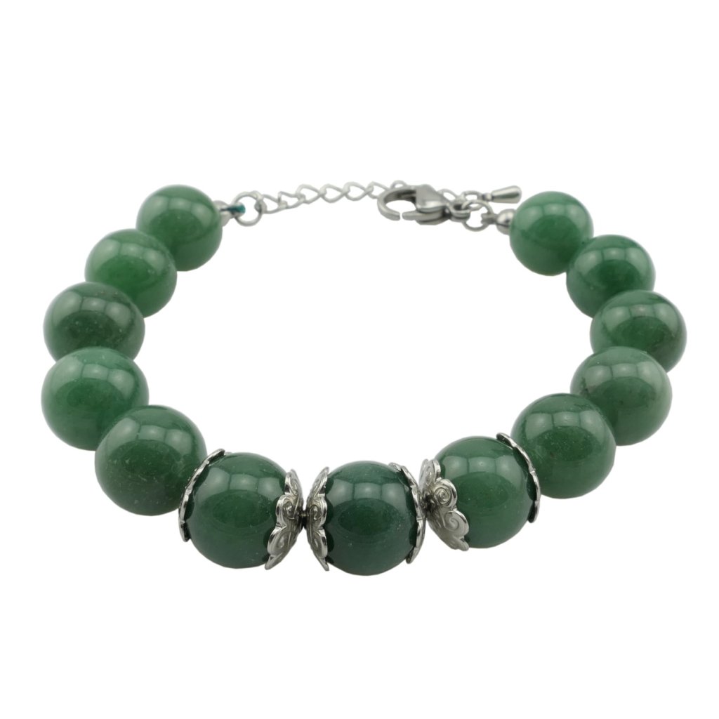 Dámsky náramok z korálok Avanturín v jeho typickej zelenej farbe. Náramok je zdobený krásnymi rondelkami z kvalitnej chirurgickej ocele. Zapínanie náramku je na klasickú karabínku s predĺžovacou retiazkou ktorá je taktiež z chirurgickej ocele. Z mystických vlastnosti je polodrahokam Avanturím považovaný za kameň šťastia a vracia do života lásku a nové príležitosti.Taktiež má polodrahokam pozitívnym účinkom na majetok a prosperitu.