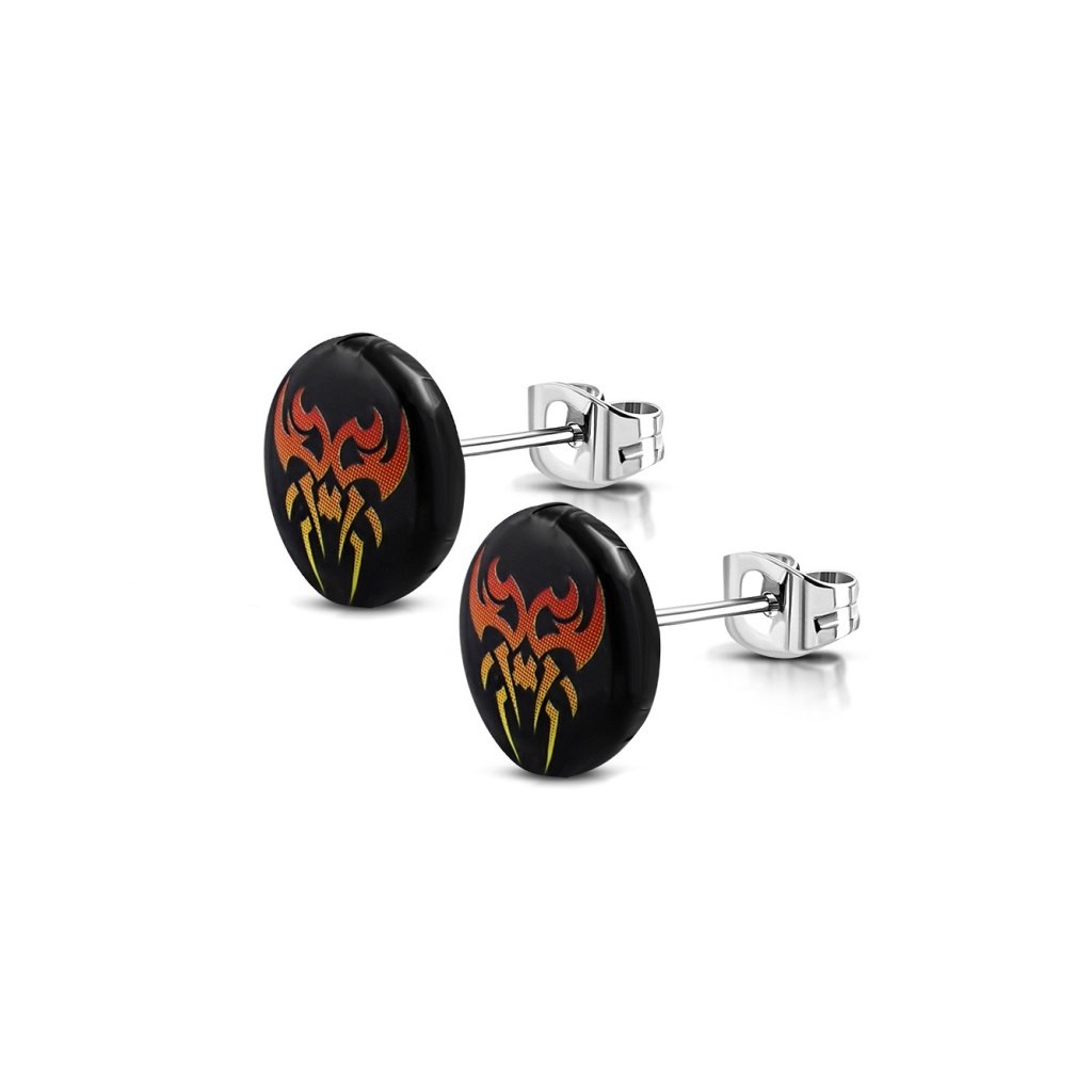 Unisex náušnice vyrobené z chirurgickej ocele. Náušnice sú čierne a na pozadí je zobrazený pavúk v ozdobnom prevedení v oranžovej farbe. Kontrast farieb vytvárajú zaujímavý celok. Sú vhodné skôr pre pánov, ale aj pre odvážne dámy. Zapínanie náušníc je puzetového typu a vyrobené z kvalitnej chirurgickej ocele. Tá je antialergická, preto náušnice môžete nosiť bez obáv každý deň.