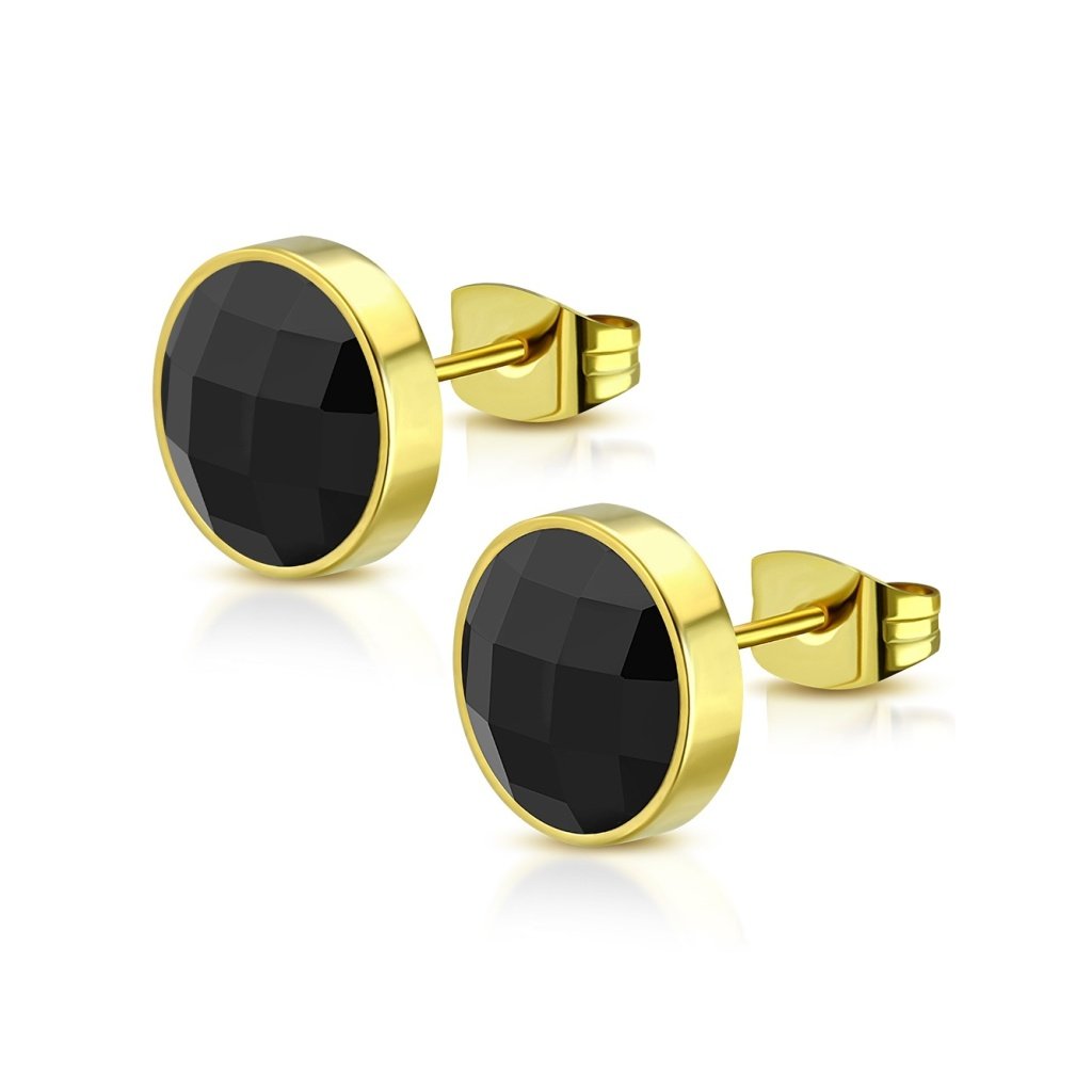Unisex náušnice vyrobené z chirurgickej ocele. Decentne náušnice sú v zlatom prevedené s čiernou výplňou brúseného vzoru. Náušnice sú vhodné pre dámy aj pre pánov, či už do práce alebo na voľný čas. Ľahko sa dajú skombinovať s inými šperkami v zlatom prevedení. Materiál náušníc je kvalitná chirurgická oceľ, ktorá zaručí dlhú životnosť Vášmu šperku. Oceľové šperky nepotrebujú žiadnu špeciálnu starostlivosť, a predsa si uchovávajú svoju farbu a lesk. Zapínanie náušníc je puzetového typu.