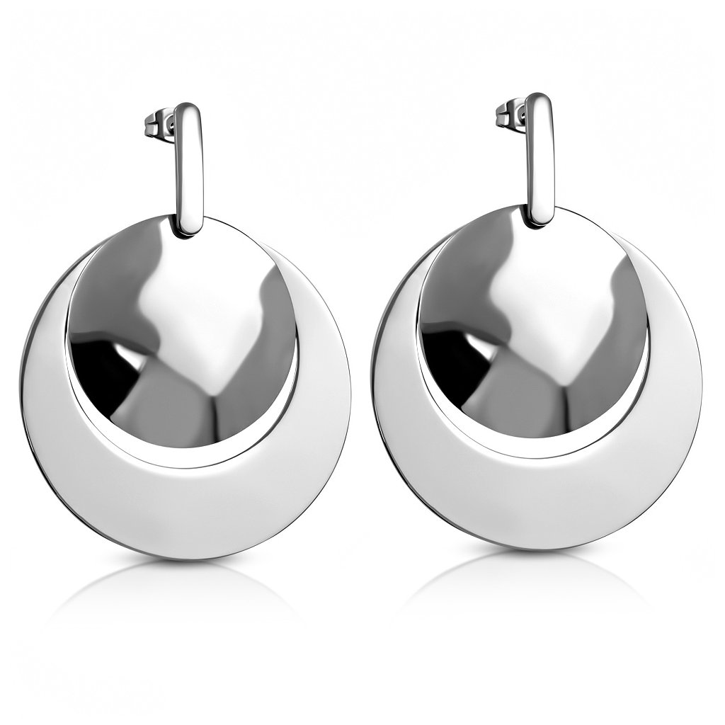 Veľmi výrazné dámske náušnice napichovacie z vysoko leštenej striebornej chirurgickej ocele s motívom kruhov. Náušnice tvorí 2 cm dlhá hranatá puzeta, na ktorej sú povesené dva kruhy. Vnútorný kruh je plný a má priemer 35 mm. Vonkajší kruh je dutý a má priemer 50 mm. Náušnice majú celkovú dĺžku 70 mm. Je to výraznejší kúsok na príležitostné nosenie, ideálny spoločník na párty či oslavu. Zapínanie náušníc je puzetové.
