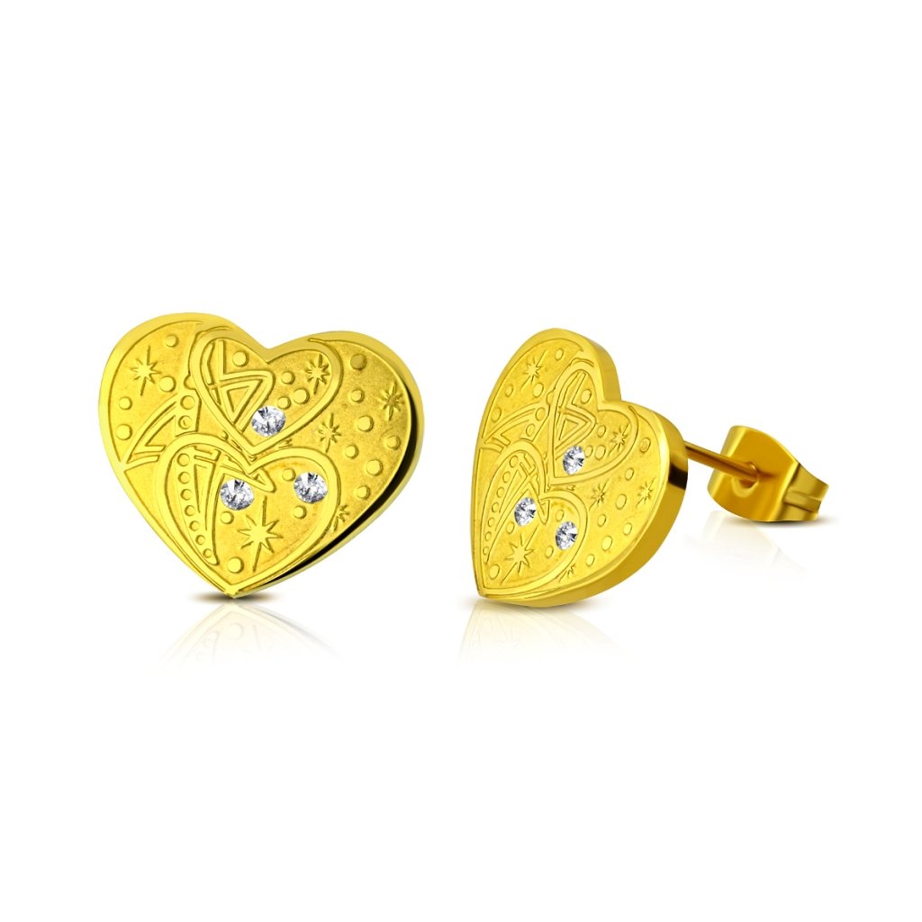 Náušnice zlaté napichovace v tvare gravírovaných srdiečok z chirurgickej ocele - Lucinda