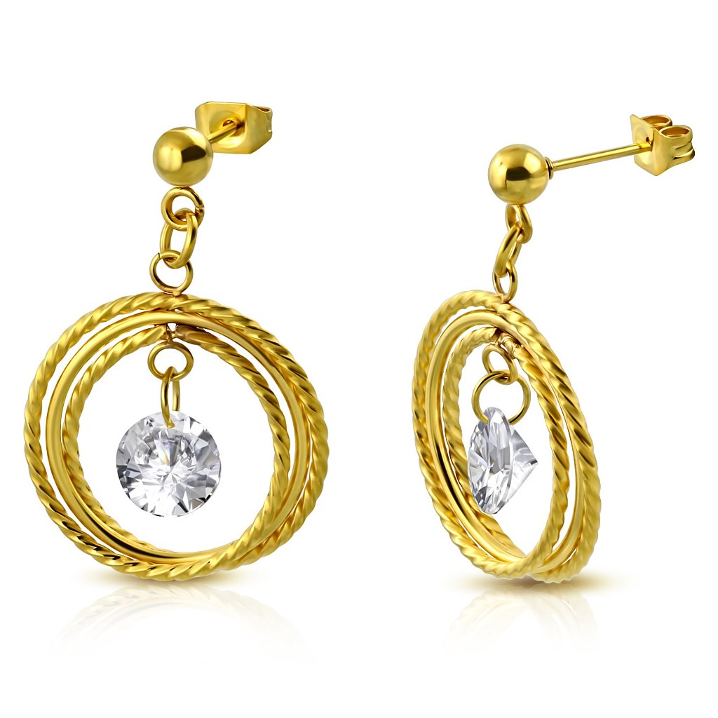 Náušnice v tvare kruhov s očkom čírej farby v zlatom prevedení