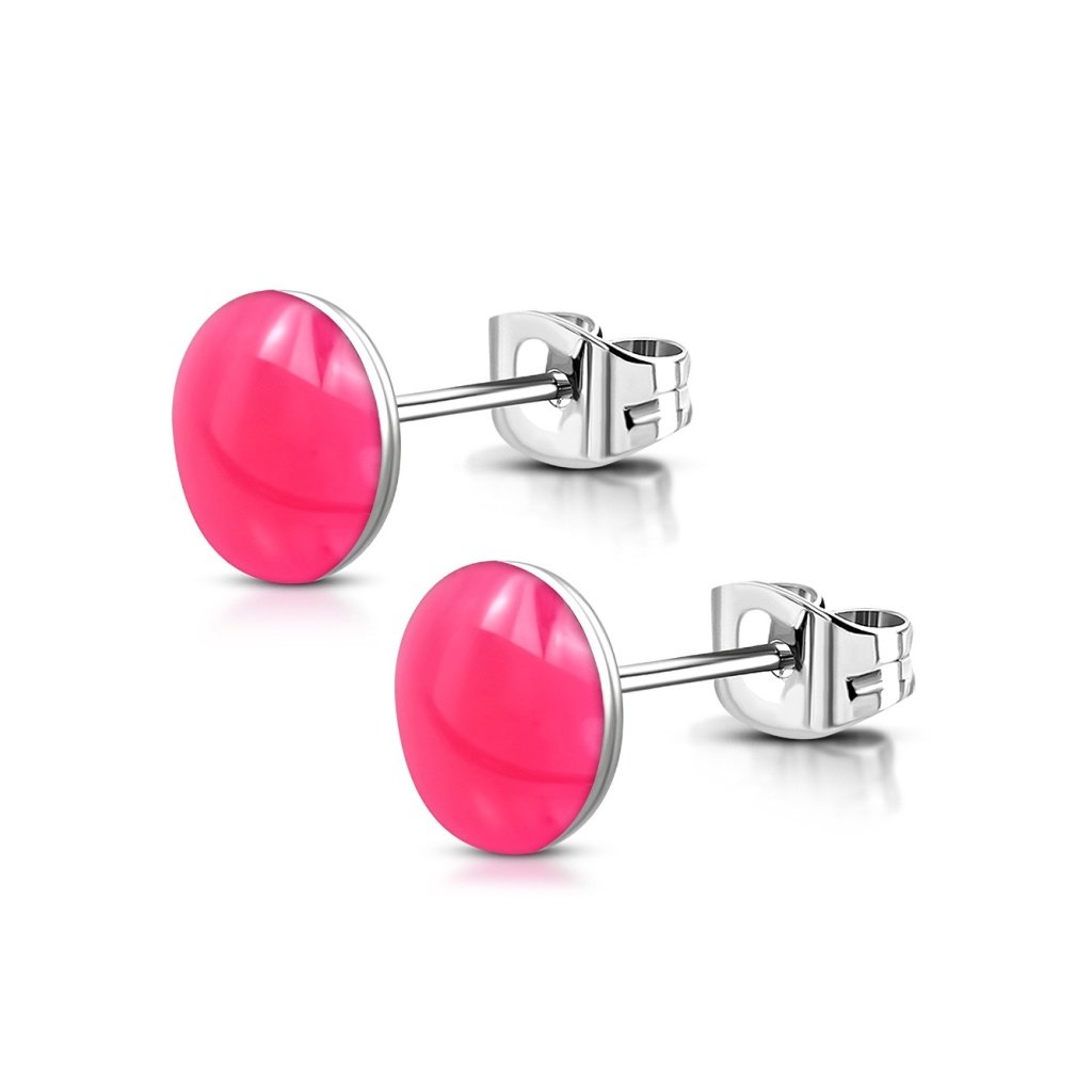 Svieže dámske náušnice z chirurgickej ocele. Náušnice majú okrúhly tvar a krásnu krikľavo ružovú farbu. Skvele s nimi doplníte svoj letný oufit, ktorý náušnice osviežia. Môžete ich skombinovať s inými šperkami ako sú napríklad náramky alebo retiazky s príveskami. Materiál náušníc je kvalitná chirurgická oceľ, ktorá je pevná a odolná. Nekoroduje a nečerná, preto sú náušnice vhodné na bežné každodenné nosenie. Zapínanie náušníc je puzetového typu.