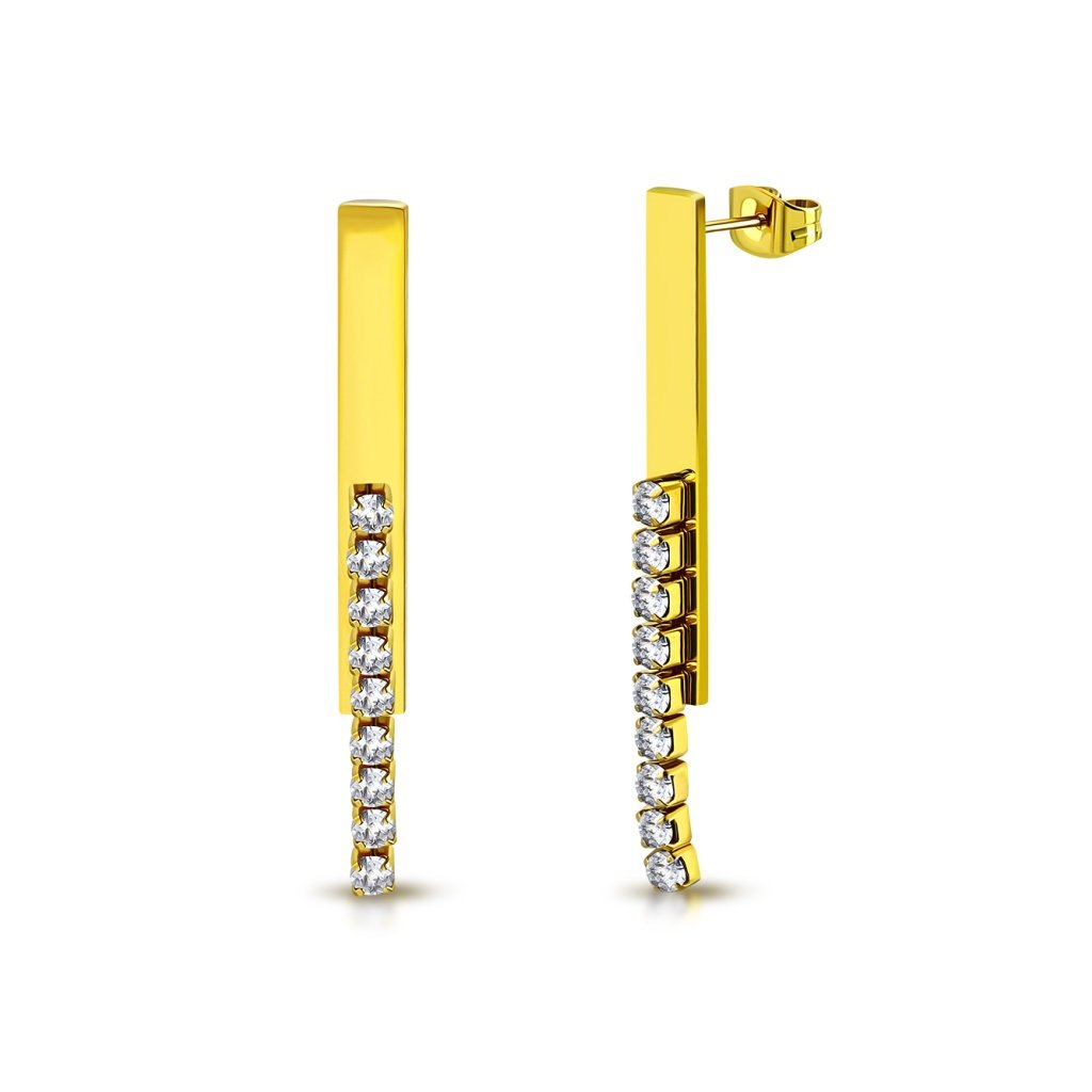 Elegantné náušnice v zlatom prevedení z chirurgickej ocele s očkami čírej farby. Náušnice majú zaujímavý obdĺžnikový tvar s visiaci očkami. Dokonale doplnia elegantný oufit každej ženy bez rozdielu vekovej kategórie. Výborne sa dajú skombinovať s inými šperkami, čím dosiahnete nádherný výsledný efekt. Náušnice sú vyrobené z kvalitnej chirurgickej ocele, ktorá je pevná a odolná. Je hypoalergénna, takže náušnice môžete nosiť každý bez obáv alergických reakcií. Zapínanie náušníc je puzetového typu.