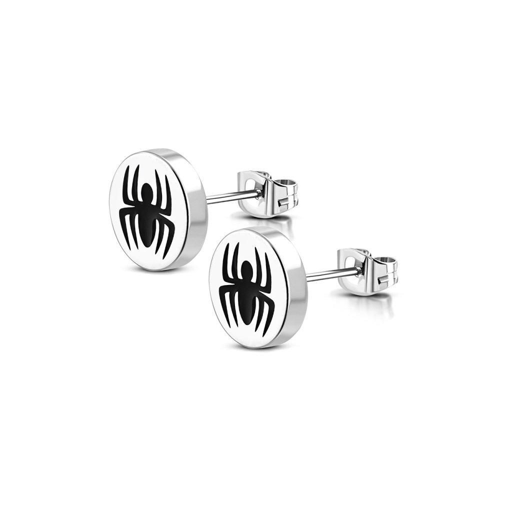 Náušnice s pavúkom z chirurgickej ocele. Pekné jednoduché náušnice, na ktorých je v čiernej farbe zobrazený pavúk. Náušnice sú vhodné pre dámy aj pre pánov, ktorí preferujú zaujímavý štýl doplnkov. Vyrobené sú z kvalitnej chirurgickej ocele, ktorá Vám zaručí dlhú živostnosť produktu. Oceľ nekoroduje ani nečerná, udržiava si svoj lesk a je vhodná na bežné každodenné nosenie, pretože je hypoalergénna.