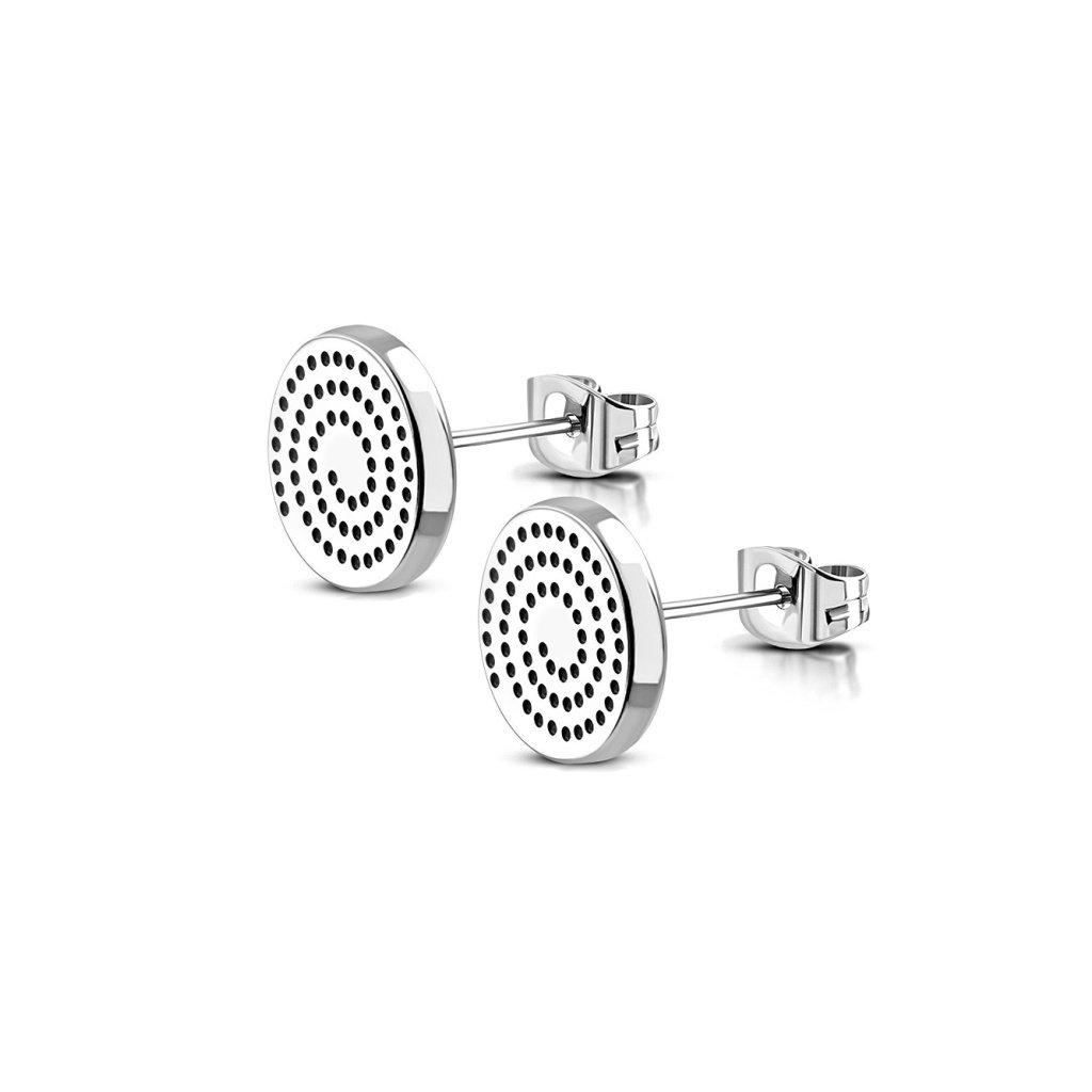 Unisex náušnice z chirurgickej ocele okrúhle v striebornej farbe. Náušnice majú špirálový vzor vytvorený z malých čiernych bodiek. Pôsobia veľmi zaujímavým dojmom a sú vhodné pre dámy aj pre pánov. Náušnice sú vyrobené z kvalitnej chirurgickej ocele, ktorá nečerná a je pevná a odolná. Pri chirurgickej oceli sa nemusíte báť alergických reakcií, pretože je hypoalergénna a vhodná na bežné každodenné nosenie.