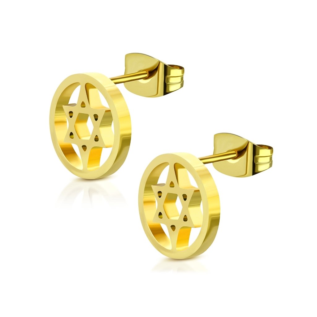 Krásne náušnice z chirurgickej ocele v zlatej farbe. Náušnice majú okrúhly tvar so šesťcípou Dávidovou hviezdou uprostred. Sú vhodné aj pre dámy aj pre pánov. Dajú sa skvele skombinovať s inými doplnkami v zlatej farbe. Náušnice sú vyrobené z kvalitnej chirurgickej ocele, ktorá je pevná a odolná. Je hypoalergénna, takže náušnice môžete nosiť každý bez obáv alergických reakcií. Zapínanie náušníc je puzetového typu.