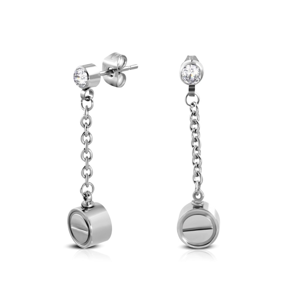 Krásne visiace dámske náušnice zo striebornej chirurgickej ocele s brúseným očkom čírej farby. Elegantné náušnice vhodné pre všetky vekové kategórie, určené nielen na bežné nosenie, ale i na slávnostné okamihy. Brúsené očko je z kubického zirkónu, ktorý sa v žiari svetla veľmi pekne ligoce. Zapínanie náušníc je puzetové. Náušnice sa dajú veľmi pekne kombinovať s ďalšími šperkami, najlepšie s tými, ktoré sa nesú v podobnom duchu ako tieto náušnice.