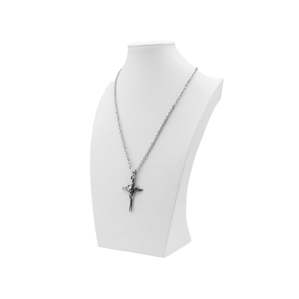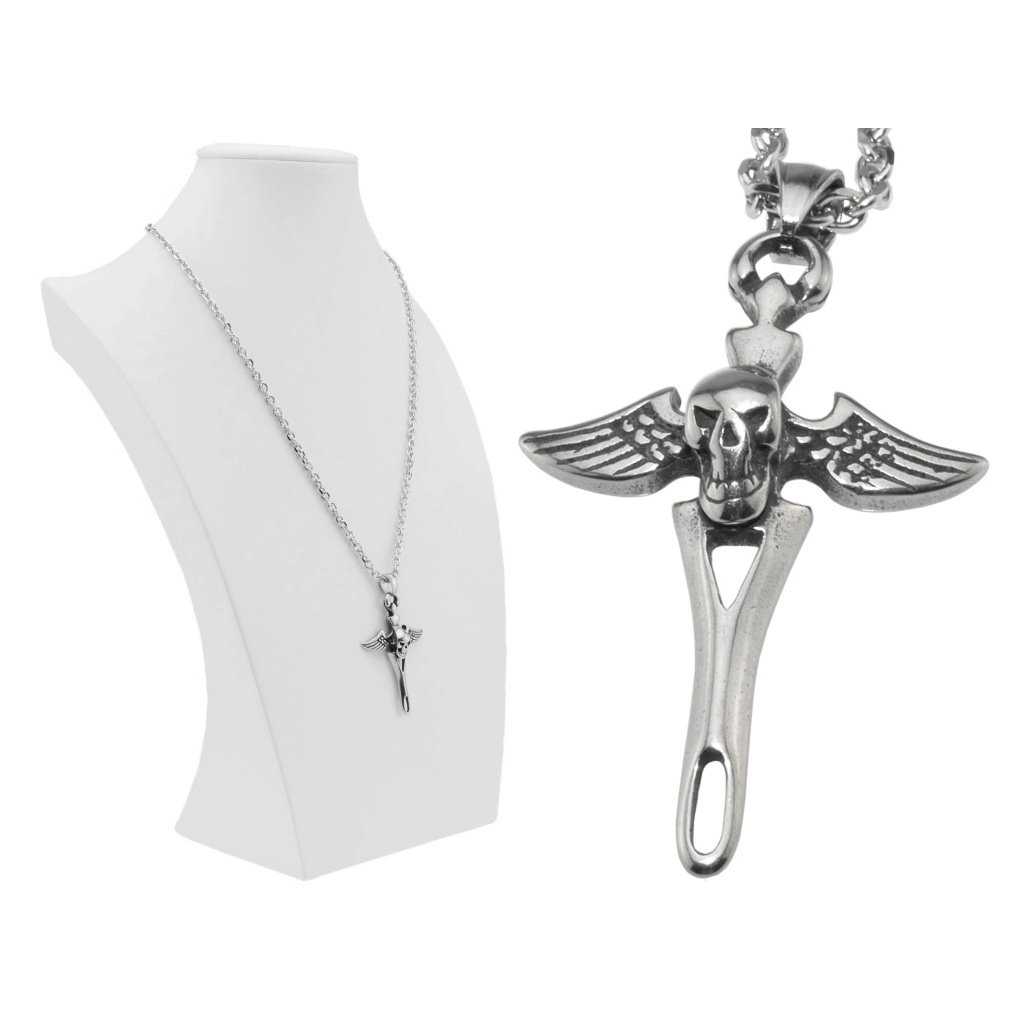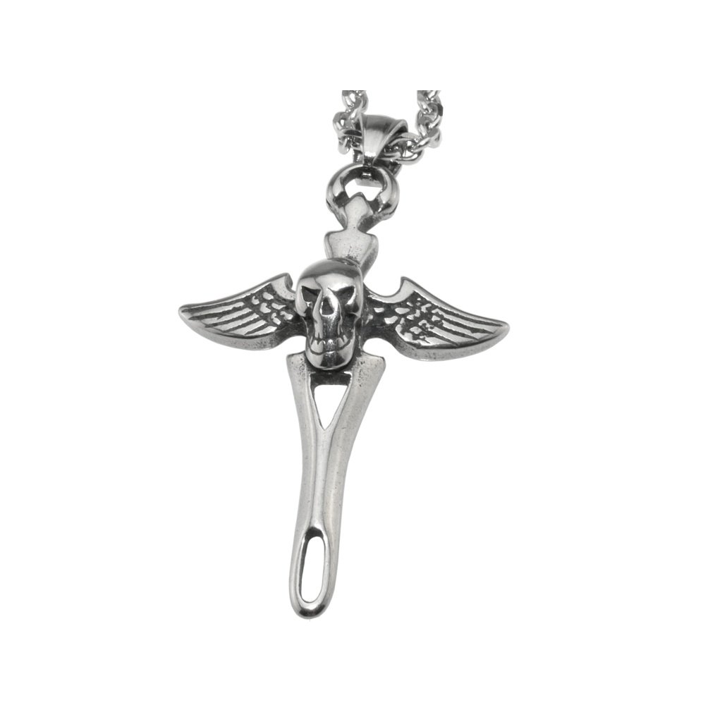 Pánska retiazka s príveskom z chirurgickej ocele. Prívesok je v tvare kríža, ktorý je zdobený v strede lebkou a krídlami. Krídla aj lebka sú tieňované tmavou patinou, čo šperku dodáva tajomný vzhľad. Je to výrazný šperk pre drsných chlapov v motorkárskom štýle. Výborne sa dá zladiť aj s inými doplnkami v podobnom štýle. Materiál retiazky a prívesku je kvalitná chirurgická oceľ, ktorá je pevná a odolná, čo zaručuje dlhú životnosť. Nepotrebuje žiadnu špeciálnu starostlivosť, nekoroduje a nečerná, je vhodná na bežné každodenné nosenie. Pri tomto šperku si viete zvoliť dĺžku retiazky podľa vlastnej potreby.