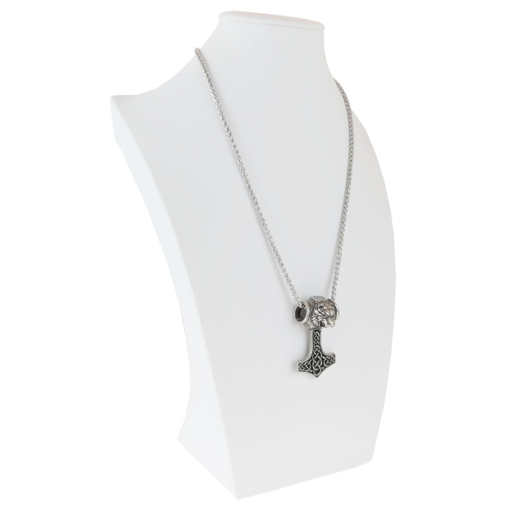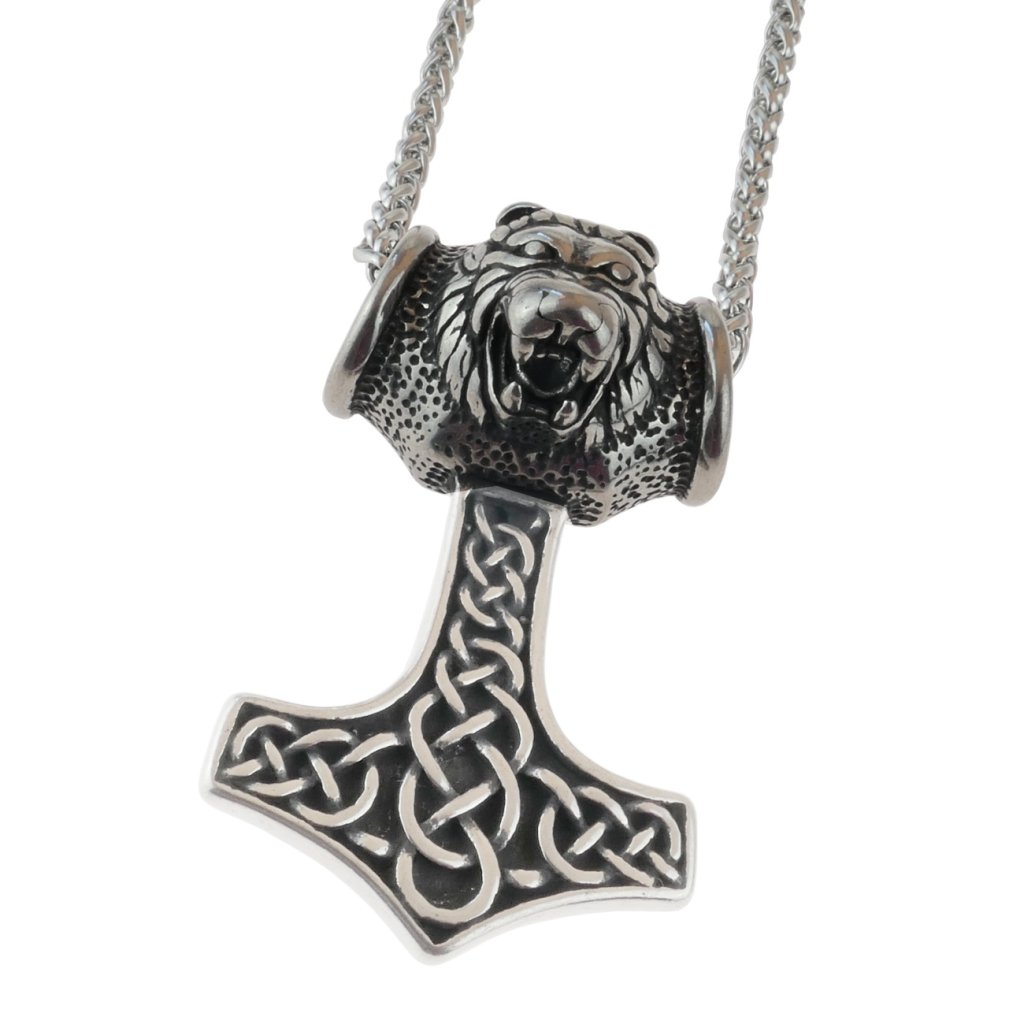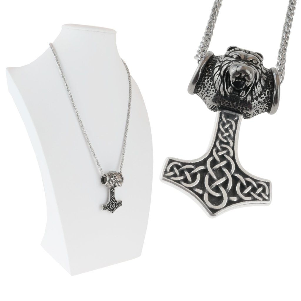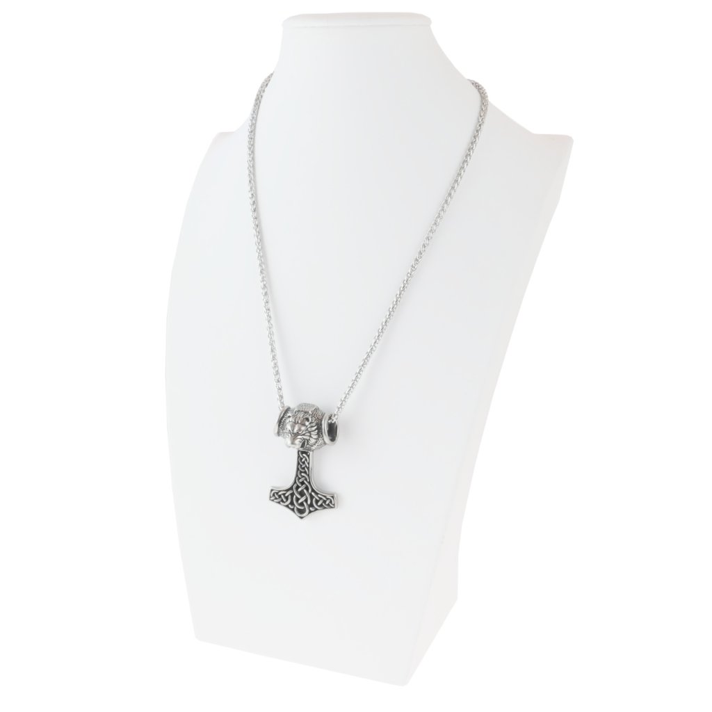 Pánska retiazka s príveskom Thorovo kladivo z ocele. Thorovo kladivo je nórdickym symbolom, ktorý predstavuje úprimnosť, vernosť, spoľahlivosť a samozrejme silu a moc. Patrí severskému bohovi Thorovi, ktorý je známy svojou silou práve vďaka svojmu kladivu. Prívesok Thorovo kladivo má tvar obráteného písmeno T, ktorý je zdobený tmavou patinou a hlavou medveďa. Retiazka s príveskom sú vyrobené z kvalitnej chirurgickej ocele. Tento materiál nepotrebuje špeciálnu starostlivosť a je vhodný na každodenné nosenie, nekoroduje a je antialergický.