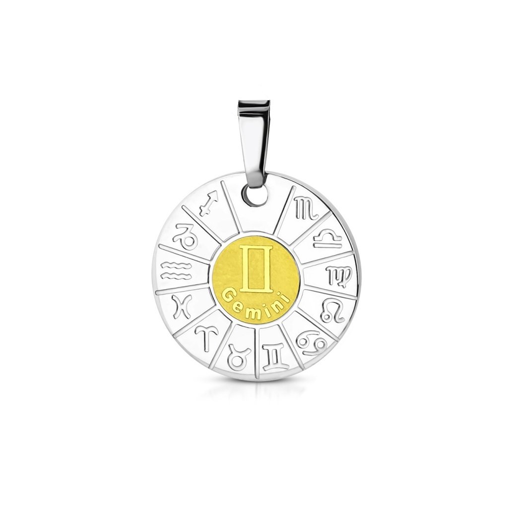 Krásny prívesok a retiazka z chirurgickej ocele v striebornej farbe v kombinácií so zlatou. Prívesok má okrúhly tvar, po obvode ktorého sú znázornené znamenia zverokruhu. V strede na zlatom pozadí je zobrazené konkrétne znamenie Gemini - Blíženci. Prívesok je vhodný pre ľudí narodených v znamení Blíženci od 21.5. do 20.6. Ľudia v tomto znamení sú často krát nespútaní a živelní, radi sa učia novým veciam. Prívesok pôsobí jemne a je skvelým doplnkom pre ženu aj muža. Materiál retiazky aj prívesku je kvalitná chirurgická oceľ, ktorá je pevná a odolná. Nestráca svoj lesk, pretože nekoroduje a nečerná. Nevyžaduje si žiadnu špeciálnu starostlivosť a je vhodná na bežné každodenné nosenie, pretože je antialergická. Pri tomto šperku máte možnosť si vybrať vlastnú dĺžku retiazky ak Vám nevyhovuje jej základná dĺžka.