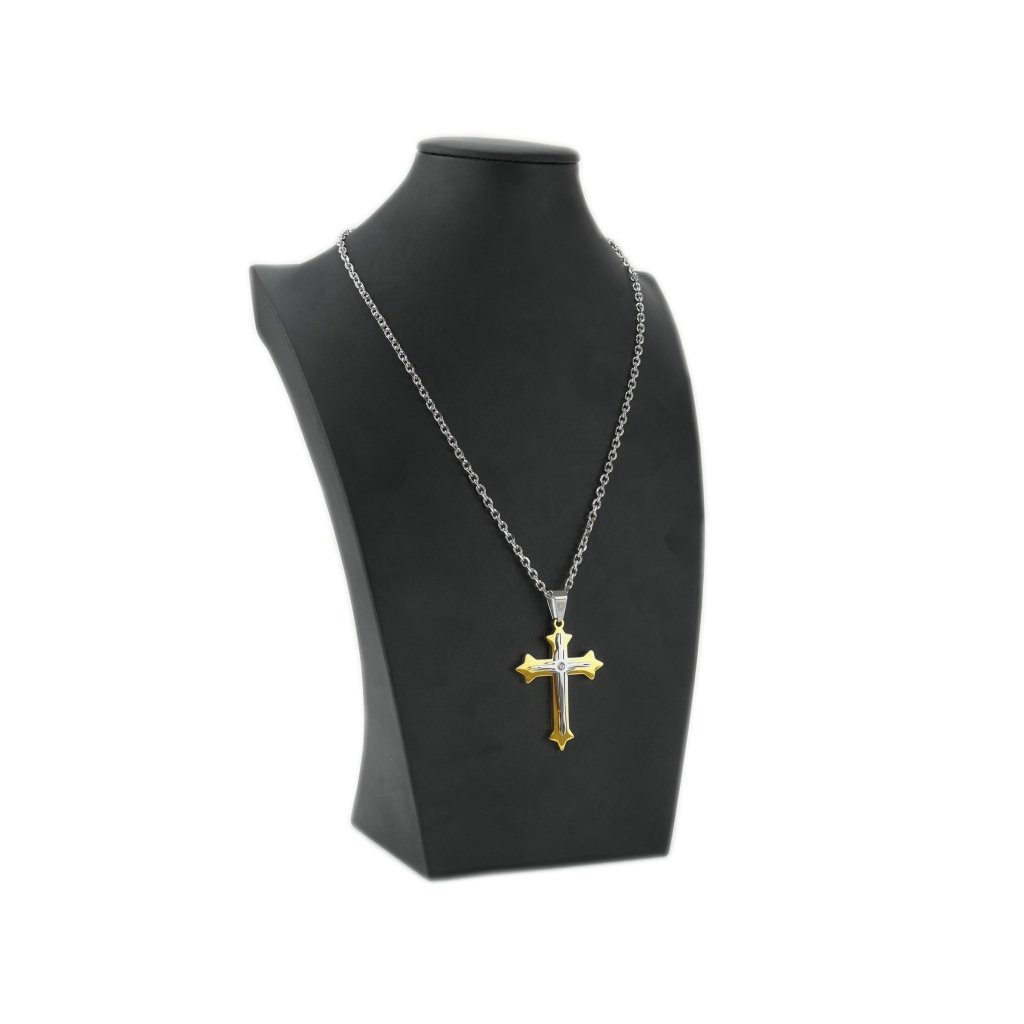 Krásny šperk retiazka s príveskom z chirurgickej ocele. Prívesok kríž je v zlatej farbe, na ktorom je ešte jeden kríž v striebornej farbe zdobený čírym očkom. Retiazka a záves na retiazku sú v striebornej farbe. Dvojfarebné kombinácie šperkov sú veľmi populárne, pretože pôsobia sviežo a moderne. Rovnako sú populárne šperky z chirurgickej ocele, pretože oceľ je pevný a odolný materiál vhodný na bežné každodenné nosenie. Pri tomto produkte si viete zvoliť Vami požadovanú dĺžku retiazky.