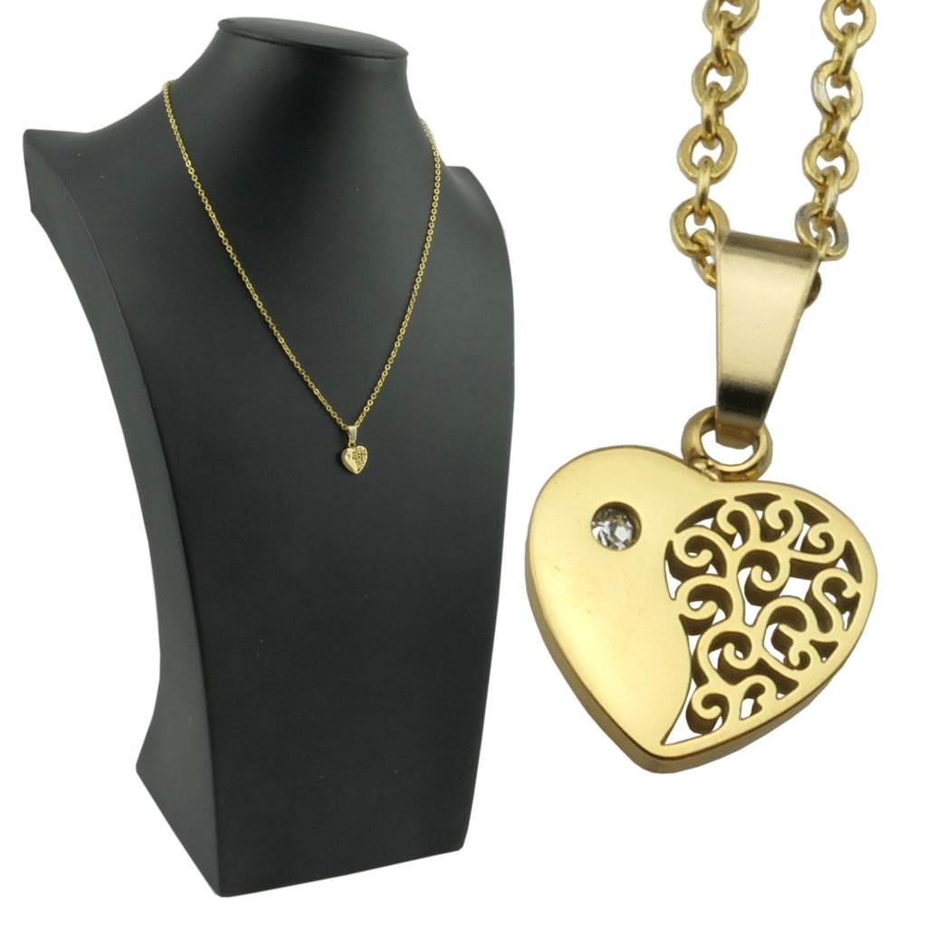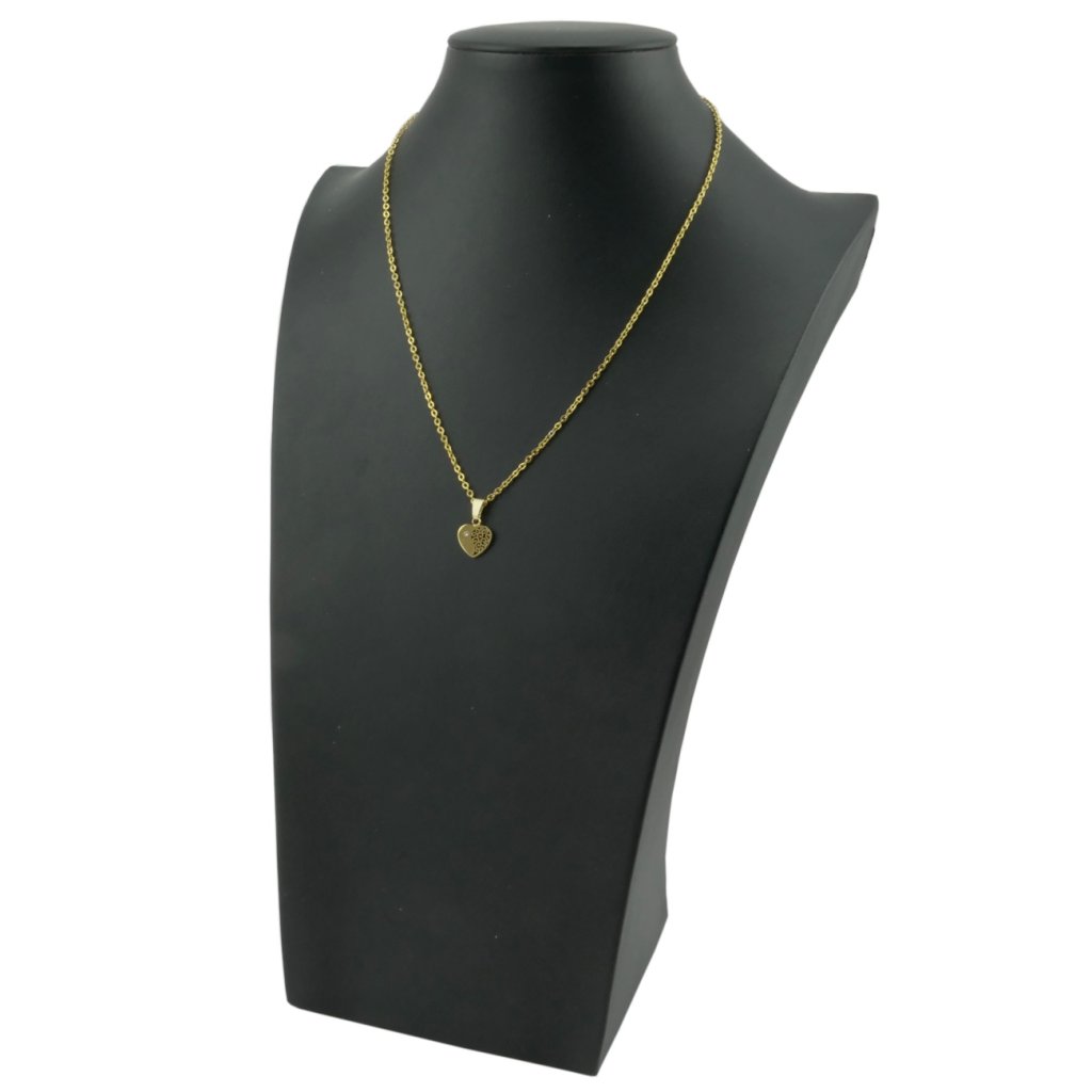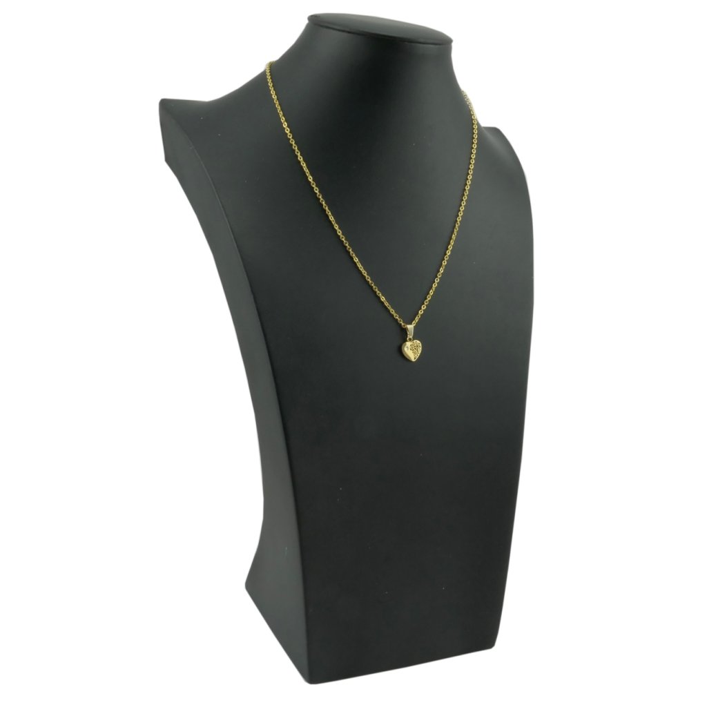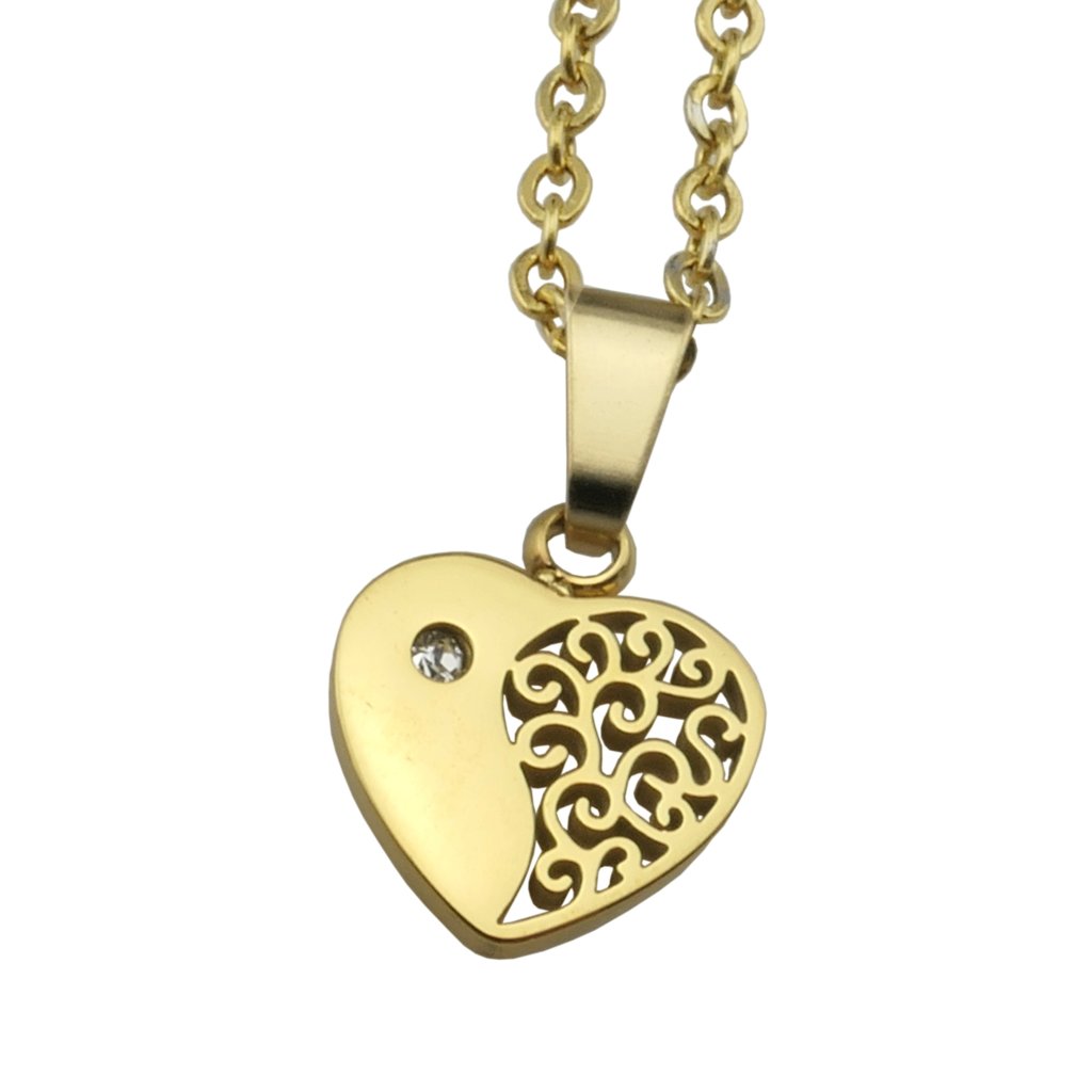 Krásna a romantická retiazka s príveskom srdiečko v zlatom prevedení. Prívesok srdiečko je z polovice vyrezávané ornamentom a na druhej polovici je umiestnené malé zirkonové očko čírej farbe. Materiál tohto šperku je kvalitná chirurgická oceľ, ktorá je veľmi populárna a obľúbená . Šperky z chirurgickej ocele nehrdzavejú ani nečernajú. Oceľové šperky môžete nosiť každý deň bez obáv alergickej reakcie, pretože sú hypoalergénne.