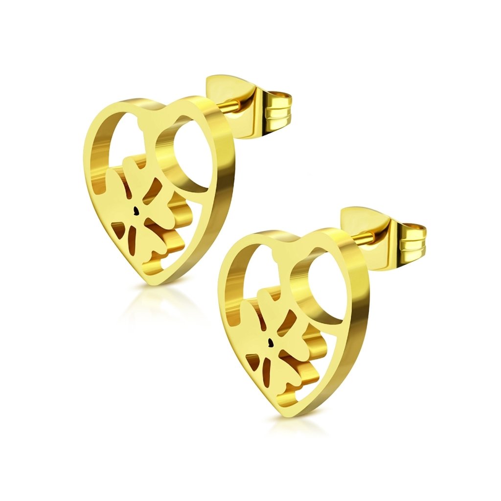 Náušnice z chirurgickej ocele v zlatom prevedení v tvare srdiečka so štvorlístkom