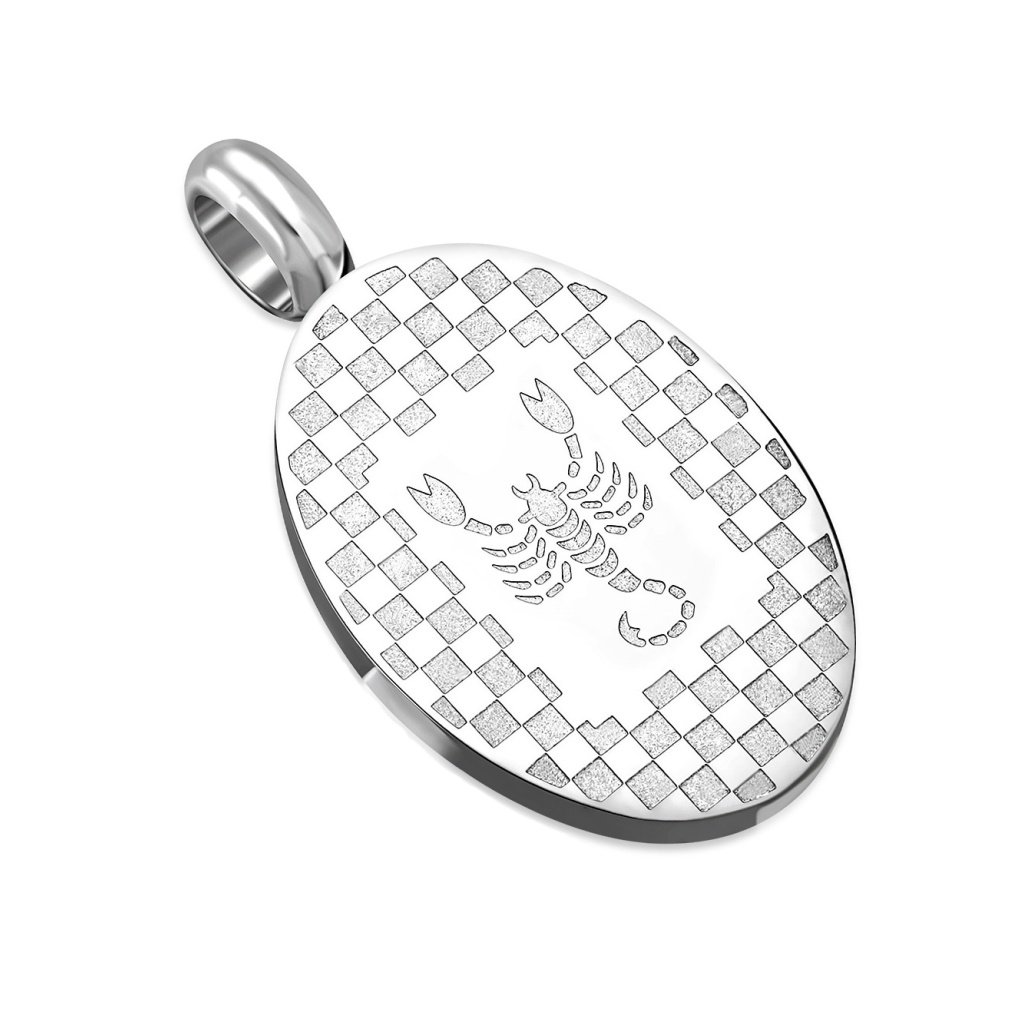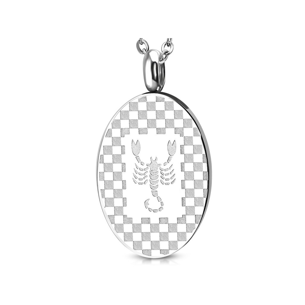 Pánsky prívesok a retiazka z chirurgickej ocele. Prívesok má oválny tvar so šachovnicovým vzorom, kde je zobrazený škorpión. Tento prívesok je vhodný pre ľudí narodených v znamení Škorpión od 23.10 do 22.11. Ľudia v tomto znamení sú tvrdohlaví a nebojácni, disponujú dobrým logickým myslením. Materiál retiazky aj prívesku je kvalitná chirurgická oceľ, ktorá je pevná a odolná. Nestráca svoj lesk, pretože nekoroduje a nečerná. Nevyžaduje si žiadnu špeciálnu starostlivosť a je vhodná na bežné každodenné nosenie, pretože je antialergická. Pri tomto šperku si viete vybrať dĺžku retiazky ak Vám nevyhovuje jej základná dĺžka.