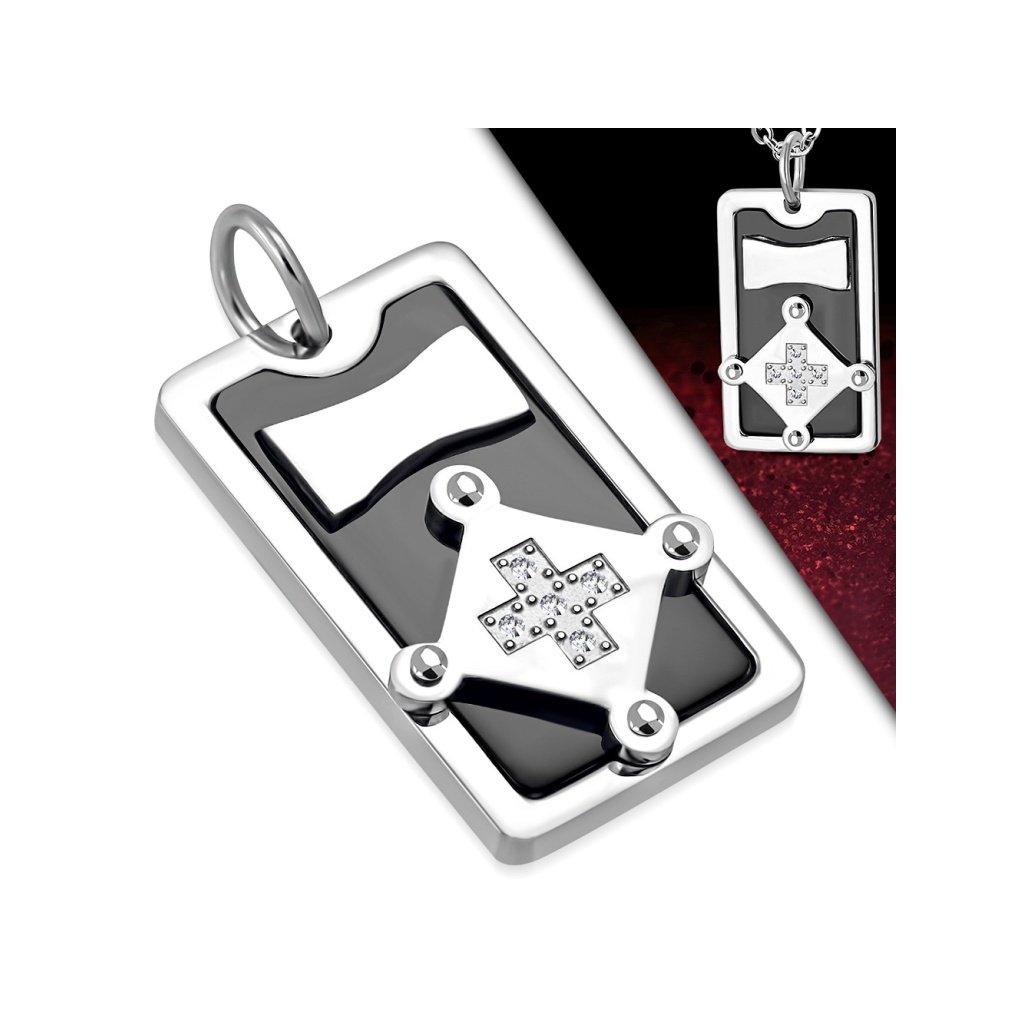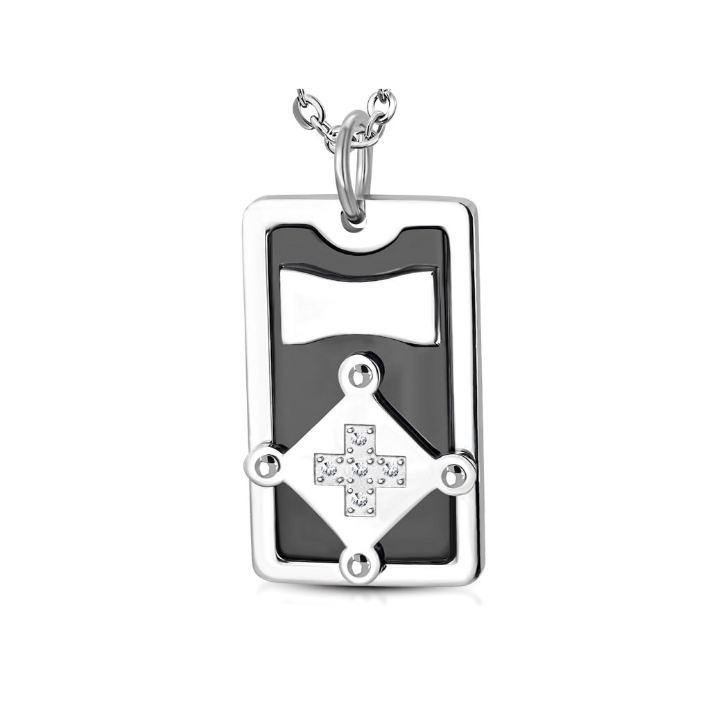 Zaujímavý pánsky prívesok vyrobený z chirurgickej ocele. Prívesok má tvar platničky s lesklým čiernym pozadím, na ktorom sú geometrické tvary v striebornej farbe. V strede štvorca je malý kríž vykladaný čírymi očkami. Prívesok pôsobí zaujímavo a pútavo a je vhodný pre všetky vekové kategórie pánov. Materiál retiazky aj prívesku je kvalitná chirurgická oceľ, ktorý Vám zaručí stály lesk a farbu Vášho šperku. Nekoroduje ani nečerná a je hypoalergénna, čo je veľmi dôležitý faktor pri výbere šperkov. Pri tomto produkte si môžete zvoliť Vami požadovanú dĺžku retiazky ak Vám nevyhovuje základná dĺžka 60 cm.