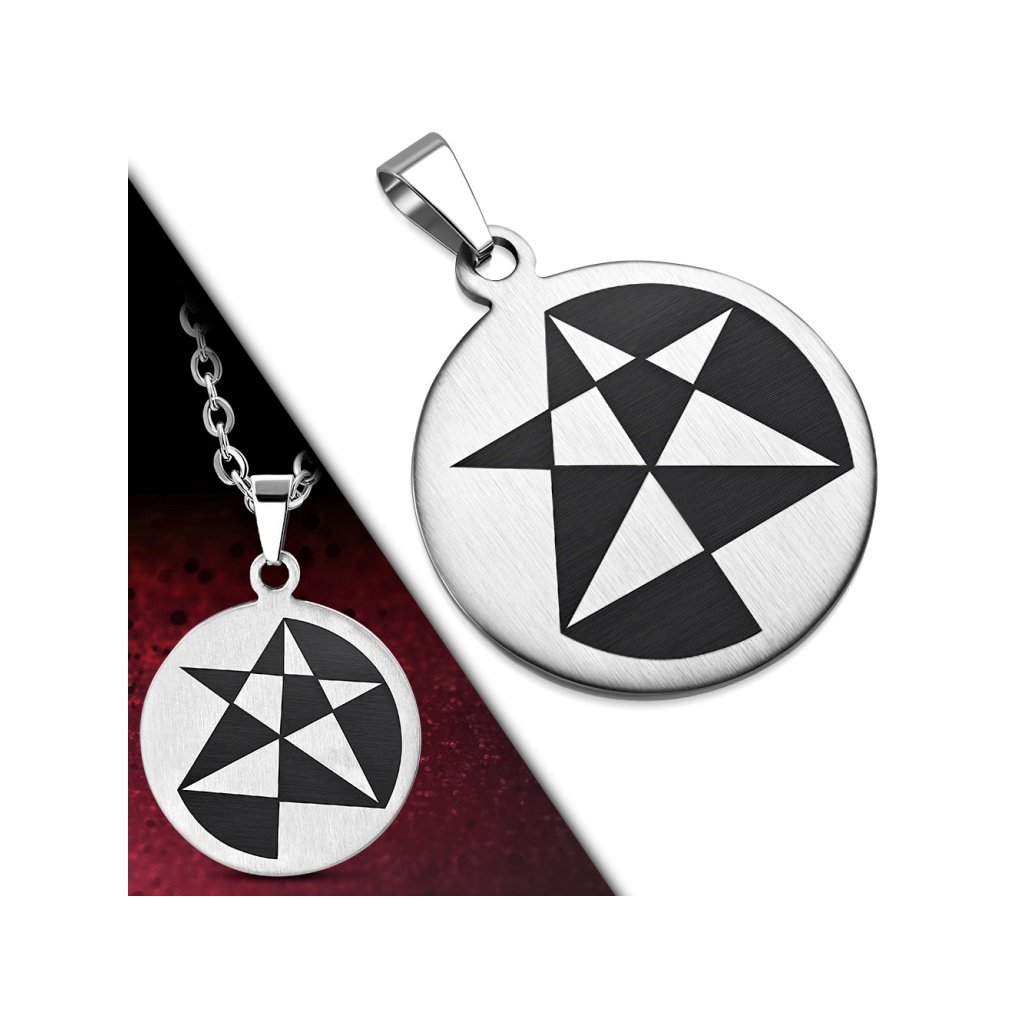 Pánska retiazka s príveskom z chirurgickej ocele v striebornej farbe. Prívesok je okrúhly, na ktorom je zobrazená hviezda poskladaná z trojuholníkov v čiernej farbe. Geometrické zobrazenie hviezdy pôsobí veľmi zaujímavo, čo robí šperk výnimočným. Materiál retiazky aj prívesku je odolný a pevný, čím je chirurgická oceľ. Tá nečerná ani nekoroduje, preto je vhodným materiálom pre šperky. Nevyžaduje si žiadnu špeciálnu starostlivosť a je vhodná na bežné každodenné nosenie. Pri tomto produkte si môžete môžete zvoliť aj Vami požadovanú dĺžku retiazky.