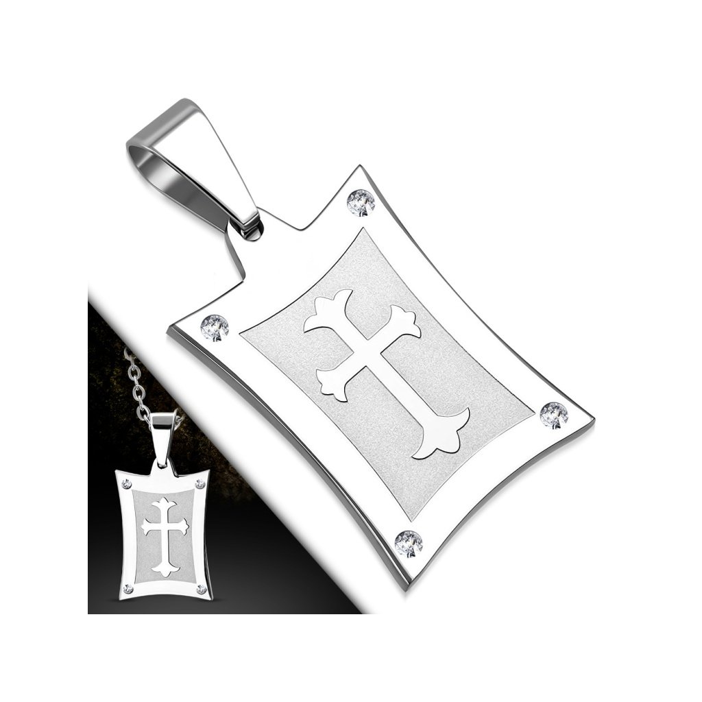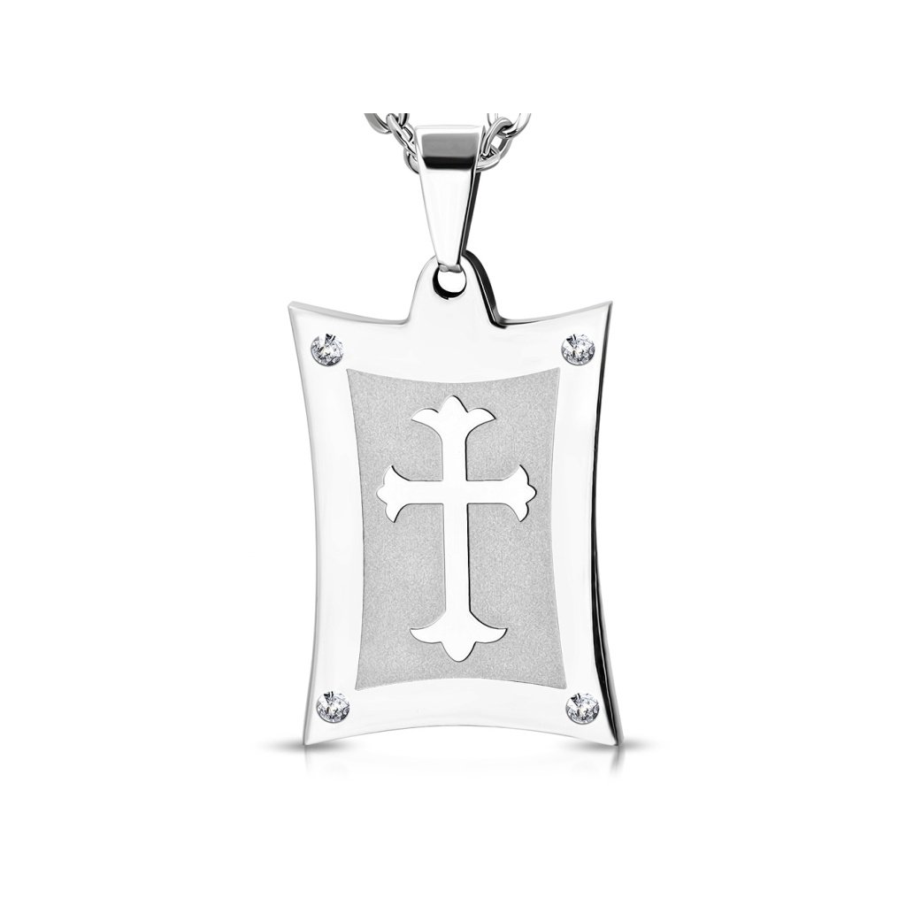 Pánska retiazka s príveskom platnička v striebornej farbe. Prívesok platnička má tvar hranatého obdlžníka. V každom rohu je zdobený malým čírym očkom. V strede na matnom pozadí, je ozdobne zobrazený kríž. Prívesok ma strednú veľkosť a hodí sa pre pánov, ktorí si ho ľahko doplnia napríklad náramkom. Materiál retiazky aj prívesku je kvalitná chirurgická oceľ, ktorá je veľmi pevný a odolný materiál a zaručí Vám dlhú životnosť šperku. Udržiava si svoj lesk, pretože chirurgická oceľ nekoroduje a nečerná a nevyžaduje si žiadnu špeciálnu starostlivosť. Pri tomto šperku si viete zvoliť dĺžku retiazky podľa vlastnej potreby.