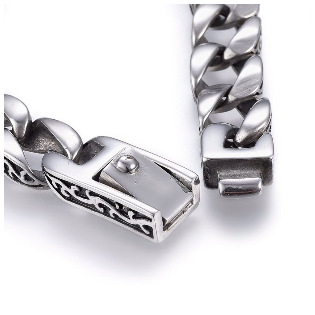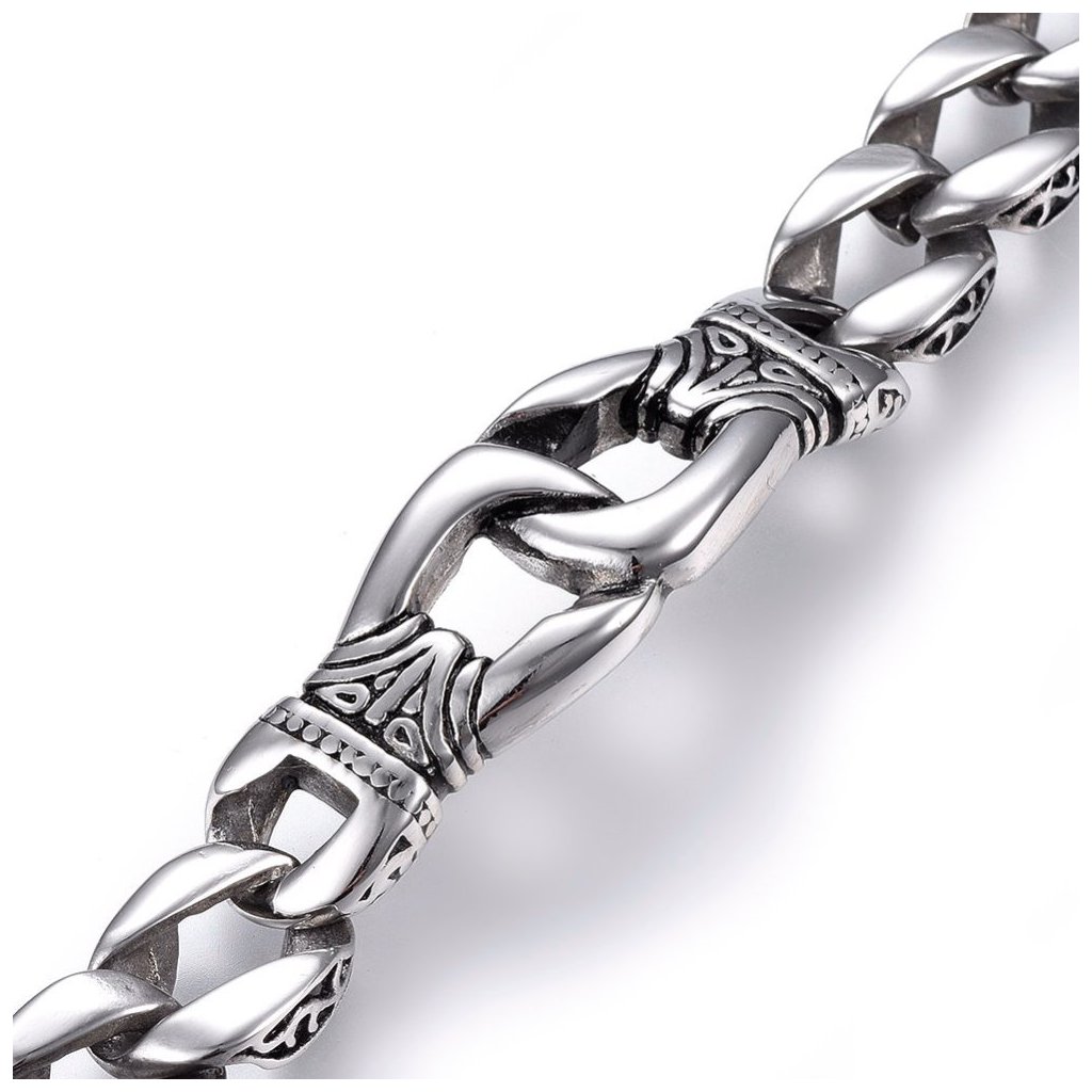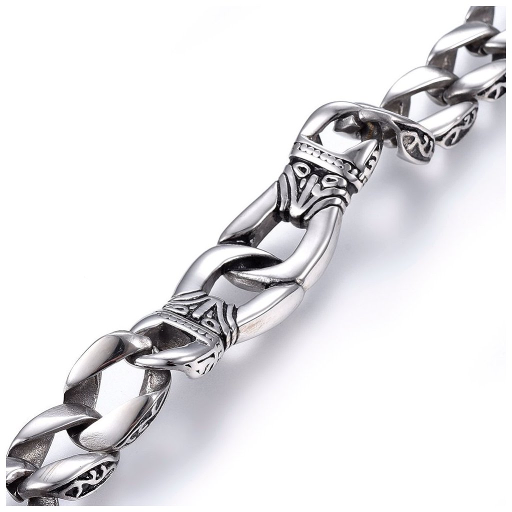 Mohutné články náramku nesú unikátne gravírované motívy inšpirované nordickými mytológiami, konkrétne drakom, ktorý je symbolom ochrany a moci. Tento detailný dizajn dodáva náramku jedinečný charakter a robí z neho nielen šperk, ale aj silný vyjadrovací prostriedok osobnosti.