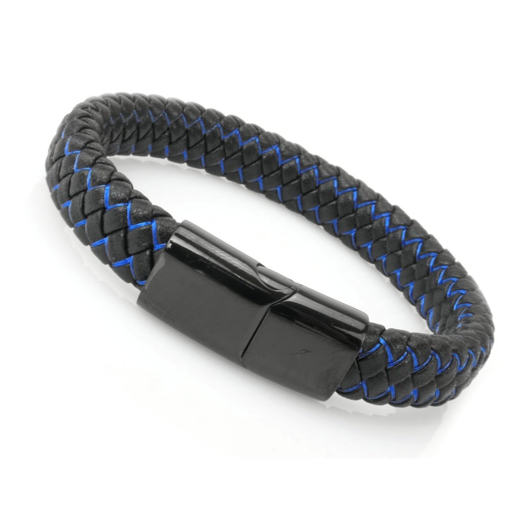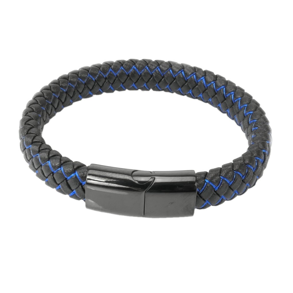 Moderný pánsky náramok vyrobený z eko kože v kombinácií s kvalitnou chirurgickou oceľou. Eko koža je skvelá alternatíva k zvieracej koži. Je často vyhľadávaná a pánske náramky z nej patria medzi tie najviac obľúbené, pretože sú moderné a štýlové. Náramok má pletený vzor, v ktorom je zapletená jemná niť modrej farby, ktorá úžasne vynikne na čiernej farbe. Zapínanie je magnetické a vyrobené z chirurgickej ocele.