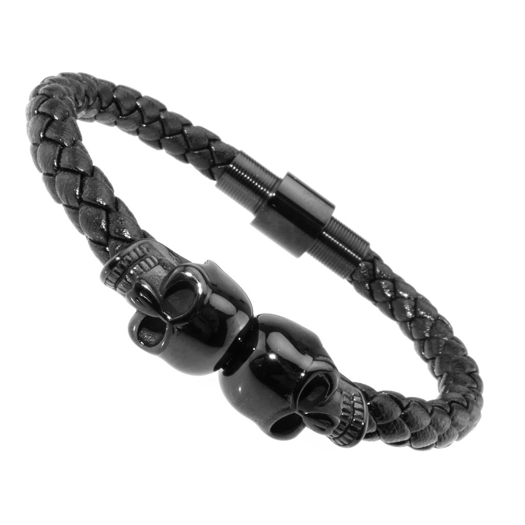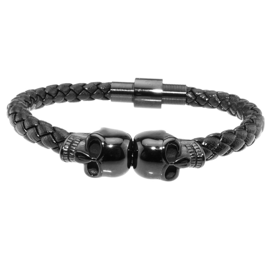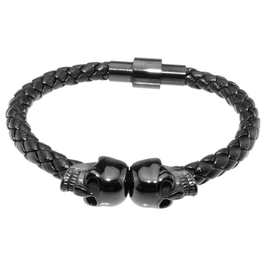 Pánsky náramok z eko kože a ocele. Zaujímavý pánsky šperk, náramok z eko kože a ocele je zdobený dvomi lebkami v strede náramku. Tento pánsky náramok je tak vhodný napríklad pre pánov, ktorí preferujú motorkársky štýl. Náramky z eko kože patria medzi často vyhľadávané, pretože sú štýlové a moderné. V kombinácií s čiernou chirurgickou oceľou pôsobí tento náramok vkusne a je vhodný pre pánov na bežné každodenné nosenie. Zapínanie náramku je magnetické z ocele.