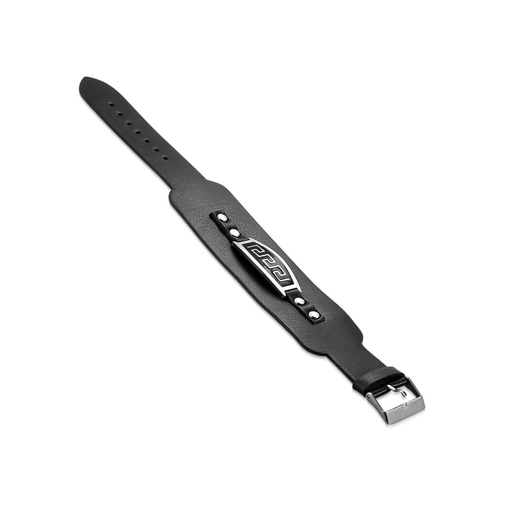 Pánsky hrubý náramok z eko kože v kombinácií s chirurgickou oceľou. Náramok je hrubší a zdobený platničkou z chirurgickej ocele, na ktorej na znázornený grécky vzor. Platnička je ešte z oboch strán zdobená vybíjaním. Náramok je vhodný pre pánov, ktorí preferujú výraznejšie doplnky. Hoci náramok pôsobí masívnejšie, je veľmi ľahký a eko koža je príjemná na dotyk. Zapínanie náramku je hodnikového typu, vďaka ktorému si viete zvoliť požadovanú veľkosť náramku.