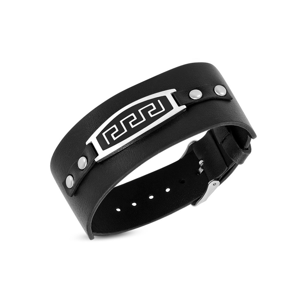 Pánsky náramok z eko kože a chirurgickej ocele s platničkou s gréckym vzorom