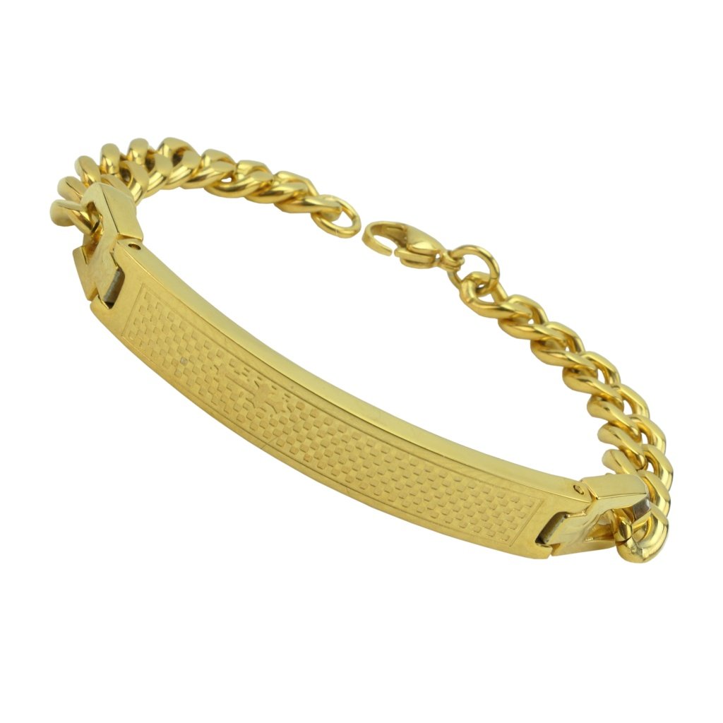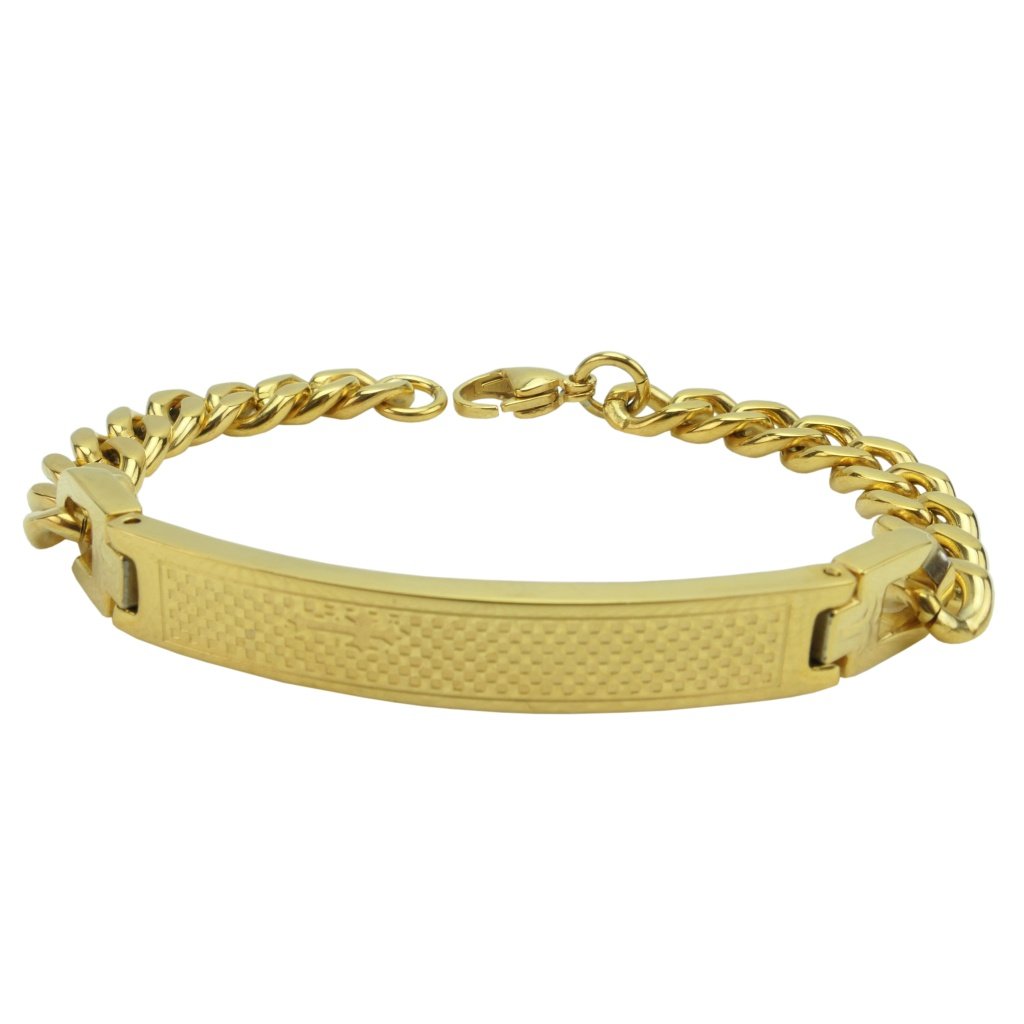 Elegantný náramok pre pánov s platničkou v zlatom prevedení. Pánsky náramok je vyrobený z kvalitnej chirurgickej ocele, ktorá je pevná a odolná, a nevyžaduje si žiadnu špeciálnu starostlivosť. Náramok sa skladá z plochých očiek a platničky, ktorá ma šachovnicový vzor a malý krížik. Náramok je vhodný pre pánov na bežné každodenné nosenie a skvele doplní akýkoľvek outfit. Oceľové šperky majú dlhú životnosť, pretože nečernajú a nehrdzavejú, udržiavajú svoj tvar a lesk. Zapínanie náramku je na klasickú karabínku.