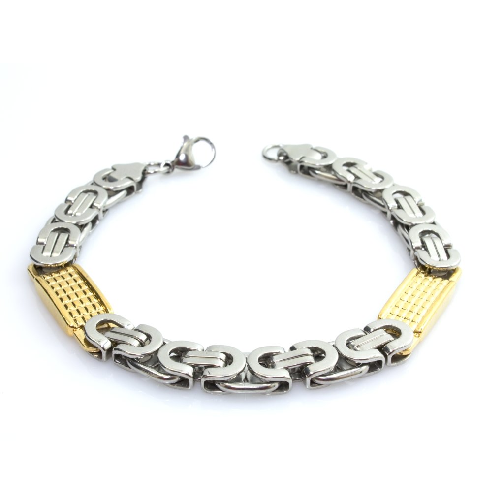 Pánsky náramok je vyrobený z kvalitnej a odolnej 316L chirurgickej ocele. Povrch náramku je hladký a krásne leštený. Náramok pánov uchváti svojím dizajnom, je totiž je zhotovený v obľúbenom pánskom vzore byzantine v striebornej farbe, ktorý je ozvláštnený o platničky v zlatej farbe. Zapínanie náramku je na klasickú karabínku ktorá je samozrejme taktiež z chirurgickej ocele. Materiál chirurgická oceľ si nevyžaduje žiadnu špeciálnu starostlivosť, je veľmi odolný a len tak ľahko sa nepoškriabe. Zároveň na rozdiel od materiálov, akým je bižutéria či striebro, chirurgická oceľ nekoroduje a ani nečerná, čo zaručuje skutočne dlhú životnosť a farebnú stálosť tohto pánskeho setu. Taktiež je chirurgická oceľ hypoalergénna, čo je v súčasnosti pri výbere šperkov určite rozhodujúci faktor.