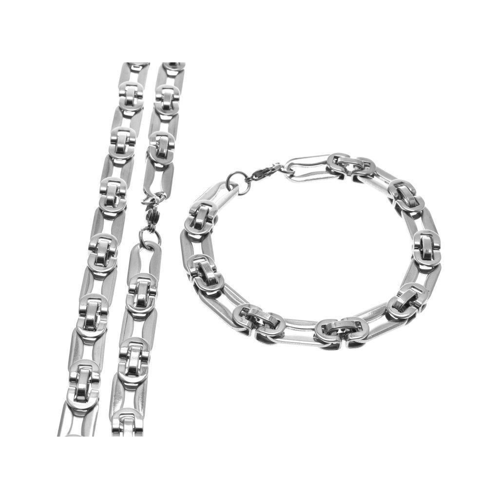 Nádherný pánsky set vyrobený z chirurgickej ocele. Set má obľúbený kráľovský vzor v modernom prevedení. Set je jednoduchý, no predsa krásne vynikne na každom mužovi. Plochý kráľovský vzor patrí medzi často vyhľadávané vzory šperkov. Tento set môžete nosiť k bežnému outfitu, alebo aj k elegantnejšiemu. Retiazka aj náramok si uchovávajú svoj lesk aj farbu vďaka kvalitnej chirurgickej ocele, z ktorej sú vyrobené. Oceľ nečerná ani nekoroduje a nevyžaduje si žiadnu špeciálnu starostlivosť. Je antialergická, takže set môžete nosiť každý deň bez obáv z alergickej reakcie.