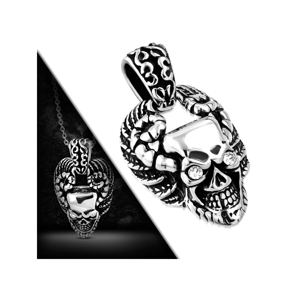 Zaujímavý pánsky prívesok z chirurgickej ocele. Prívesok má tvar lebky s baraními rohmi, ktorá je potiahnutá tmavou paitnou. Tá dodáva prívesku väčší nádych temna. Oči lebky sú vykladané malými čírymi očkami. Prívesok je vhodný pre pánov, ktorí obľubujú napríklad motorkársky štýl alebo gothic štýl. Retiazka aj prívesok sú z kvalitnej chirurgickej ocele, ktorá nekoroduje ani nečerná. Je to veľmi pevný a odolný materiál, ktorý je vhodný na každodenné nosenie a nepotrebuje žiadnu špeciálnu starostlivosť. Pri tomto produkte máte možnosť si zvoliť dĺžku retiazky podľa vlastnej potreby.