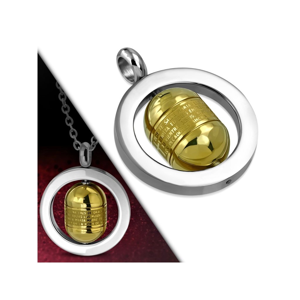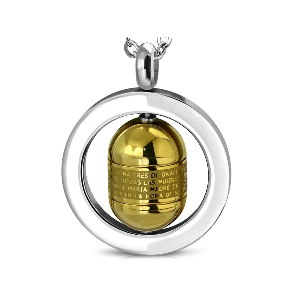 Pánsky šperk prívesok s retiazkou z chirurgickej ocele. Prívesok má zaujímavý tvar kruhu, v strede ktorého je kapsula v zlatej farbe s vygravírovanou modlitbou v španielskom jazyku. Tento prívesok je vhodný pre všetkých pánov, ktorí uprednostňujú zaujímavé a kvalitné šperky. Materiál retiazky a prívesku je kvalitná chirurgická oceľ, ktorá má mnoho výhod. Nehrdzavie, nečerná a tým si udržiava stály lesk a tvar. Nepotrebuje žiadnu špeciálnu starostlivosť a je vhodná na bežné každodenné nosenie. Oceľové šperky sú hypoalergénne. Pri tomto produkte máte možnosť si zvoliť dĺžku retiazky podľa vlastnej potreby.