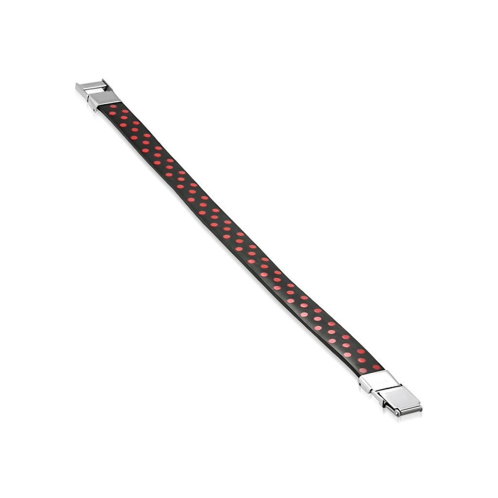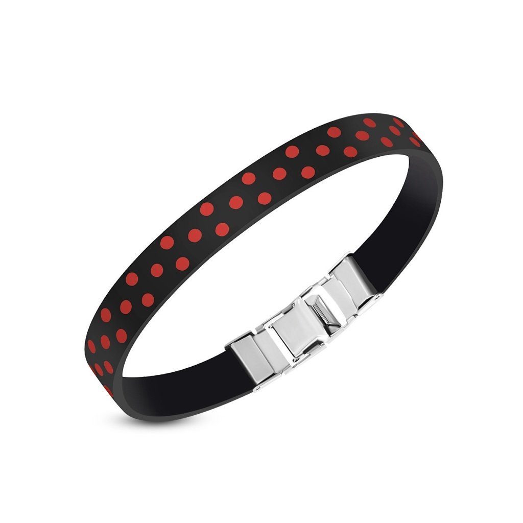 Jednoduchý pánsky náramok zo silikónovej gumy. Náramok je čiernej farby s červenými bodkami, ktoré ho robia štýlovým doplnkom, skôr pre mladších pánov. Náramok dobre zladíte napríklad s náušnicami, príveskom alebo s jednoduchou retiazkou. Zapínanie náramku je vyrobené z chirurgickej ocele, ktorá sa vyznačuje svojou dlhou životnosťou a odolnosťou, nečerná a nekoroduje. Náramok je vhodný na bežné každodenné nosenie.