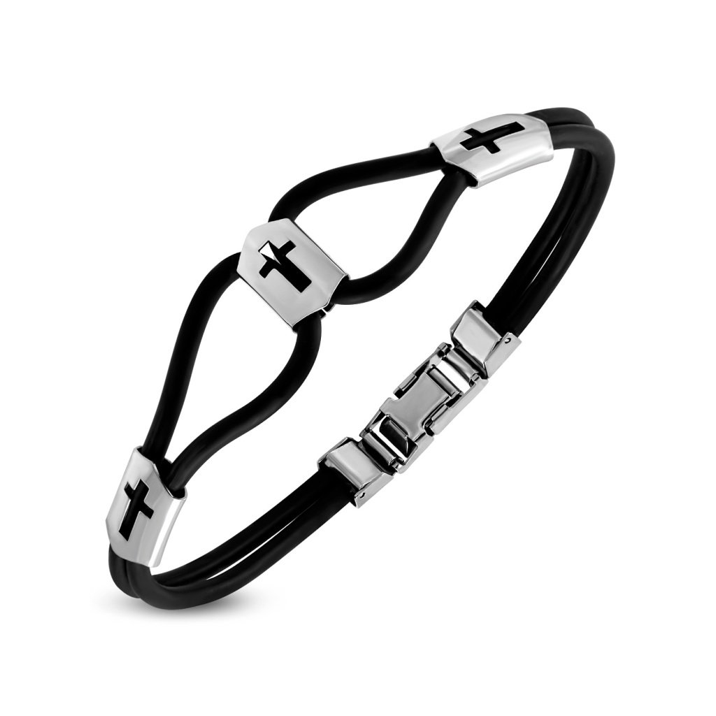 Zaujímavý pánsky náramok vyrobený zo silikónovej gumy v kombinácií s chirurgickou oceľou. Náramok pozostáva z dvoch tenších náramkov, ktoré sú spojené do jedného vďaka ozdobným trom platničkám s krížom, ktoré sú vyrobené z ocele. Celý náramok pôsobí modernom dojmom a ľahko si ním každý pán doplní svoj outfit. Hodí sa k športovému i ležérnejšiemu štýlu. Chirurgická oceľ je materiál, ktorý nekoroduje ani nečerná a nevyžaduje si žiadnu špeciálnu starostlivosť. Náramok má zapínanie hodinkového typu.
