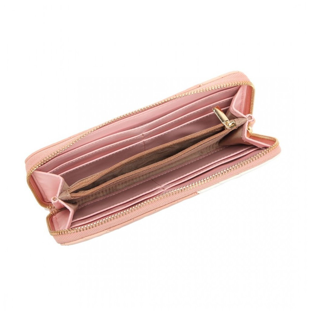 PU koža dodáva peňaženke štýlový vzhľad, a jej diagonálne prešívanie a 3 farebná kombinácia (ružová, telová, biela) pridávajú kontrast a jedinečnosť. Zips umožňuje ľahký prístup k obsahu, a popruh na zápästie zabezpečuje bezpečné nosenie.