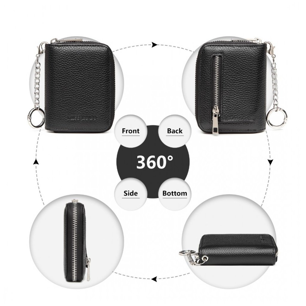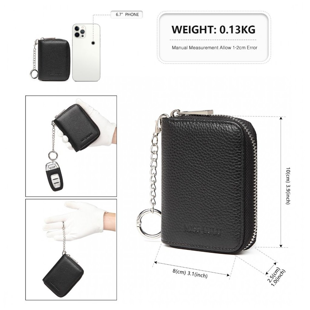 Hladká PU koža pridáva peňaženke eleganciu a jemný dotyk. Zips umožňuje jednoduchý prístup k obsahu, a retiazka na kľúče alebo držanie poskytuje dodatočnú funkčnosť a možnosť upevnenia na kľúče alebo iné drobné predmety.